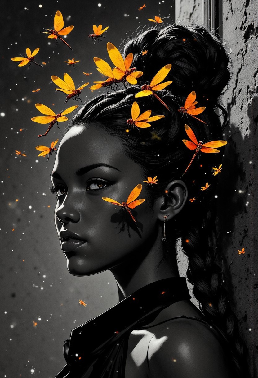 diclrpp, A cinematic black and white portrait of a African woman with an elaborate architectural cornrows hairstyle, photographed against textured gray velvet. Her skin, black satin evening robe, and surroundings are rendered in rich monochromatic tones with dramatic lighting that creates deep shadows and bright highlights. The only color comes from a cluster of vibrant yellow and orange dragonflies emerging from within her sculptural hairstyle - their wings displaying jewel tones of glowing reds and orange that appear almost luminous against the grayscale setting. Some dragonflies rest partially in her hair while others have just taken flight, creating a fluttering halo of colors around her otherwise monochrome appearance. The contrast is heightened by the perfectly still, serene expression on the woman's face, as if the chromatic emergence is a natural extension of her being rather than something extraordinary. Tiny particles of dust or pollen visible in the dramatic lighting appear temporarily colored when passing through the dragonfly cloud. .j_art