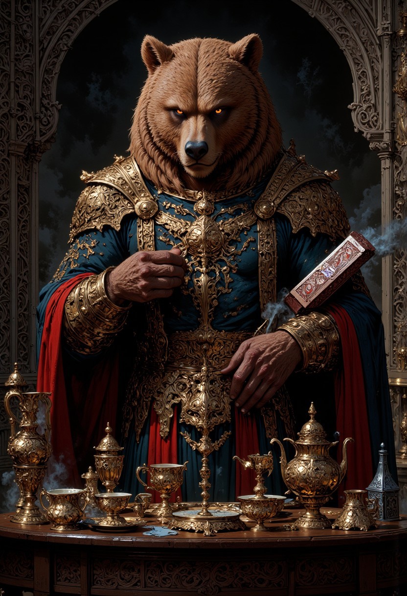 masterpiece, best quality, create a detailed oil painting in a dark fantasy style featuring a bear dressed in traditional Russian attire. The bear should be holding an ancient teacup in one paw and a chocolate bar in the other. Incorporate techniques from digital portrait art and fantasy illustration, using digital airbrushing to enhance the details. The artwork should be inspired by the Renaissance, showcasing realism and the qualities of portrait photography. Focus on creating a captivating and imaginative portrayal of this unique character, Cinematic, beautiful, vibrant, masterpiece, 32k, ultra HD, ultra-detailed, amazing quality, amazing artist, sharp edges, detailed textures, full view, atmospheric lighting, amazing visuals