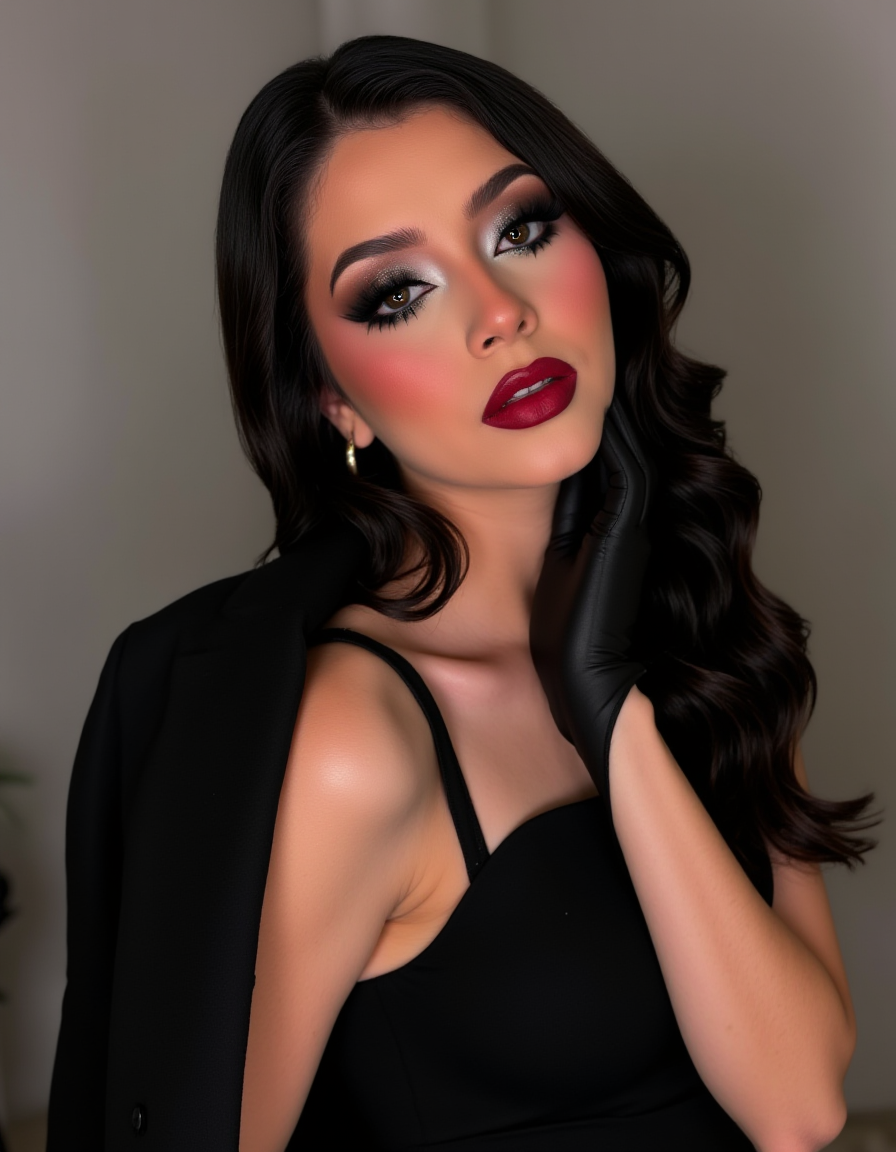 <lora:Makeup_FLUX:1>MoreMakeup. a woman with dark makeup and red lipstick posing for a picture with her hand on her chin and her hand on her shoulder, black gloves on her head and a black dress with a black jacket on her shoulder
