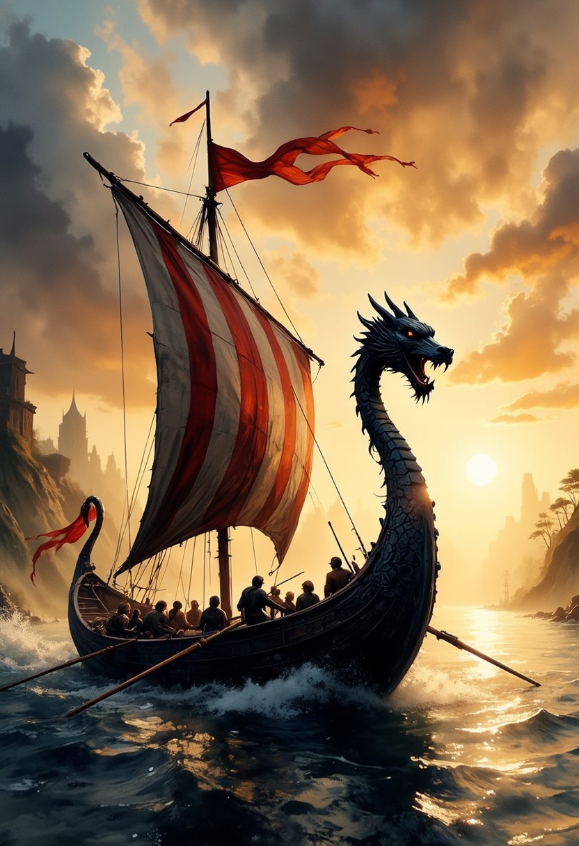 A dinkfsn style ink wash painting, magnificent. viking longships with carved dragon prow, viking rowers, choppy sea, sunset, silhouetted