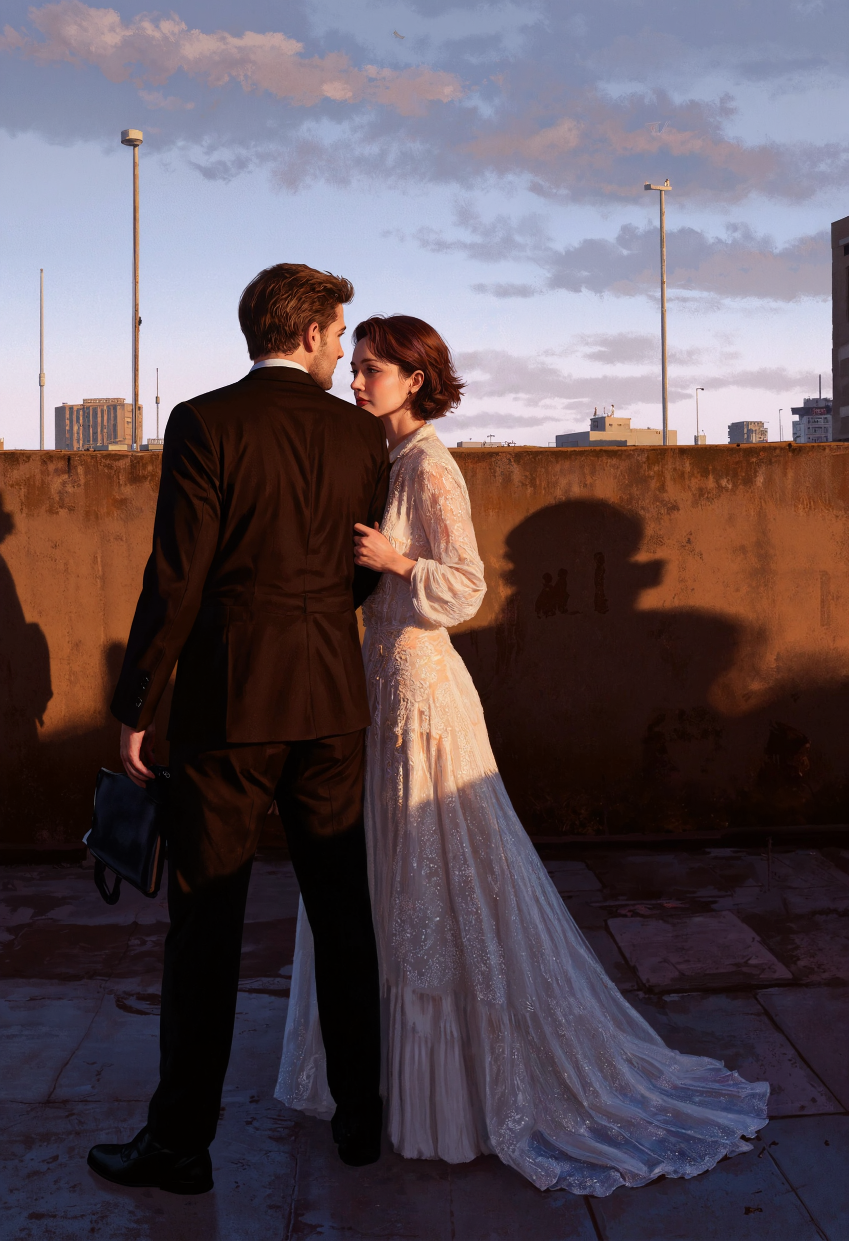 p0st_1mp4ct style, impasto, Two lovers pose on a rooftop at dusk, dressed in couture fashion, with surreal geometric shadows stretching across a skyline of silence., cinematic realism, high-fashion surrealism, romantic noir, editorial elegance, dramatic lighting, symbolic props, moody atmosphere, stylized figures, luxury aesthetic, narrative portraiture, conceptual fashion, glossy textures, rich color palette, timeless glamour, surreal composition, poised emotion, fashion editorial influence, dreamlike intimacy, dramatic silhouettes, retro-modern fusion <lora:Evangelion_Post-impact_Apocalyptic_Style_Flux.1_D_by_AutoPastel-000019:0.38> <lora:Hand v2:0.94> <lora:Dark_Gray_Photography_flux:0.16> <lora:GDX_impasto:0.75>