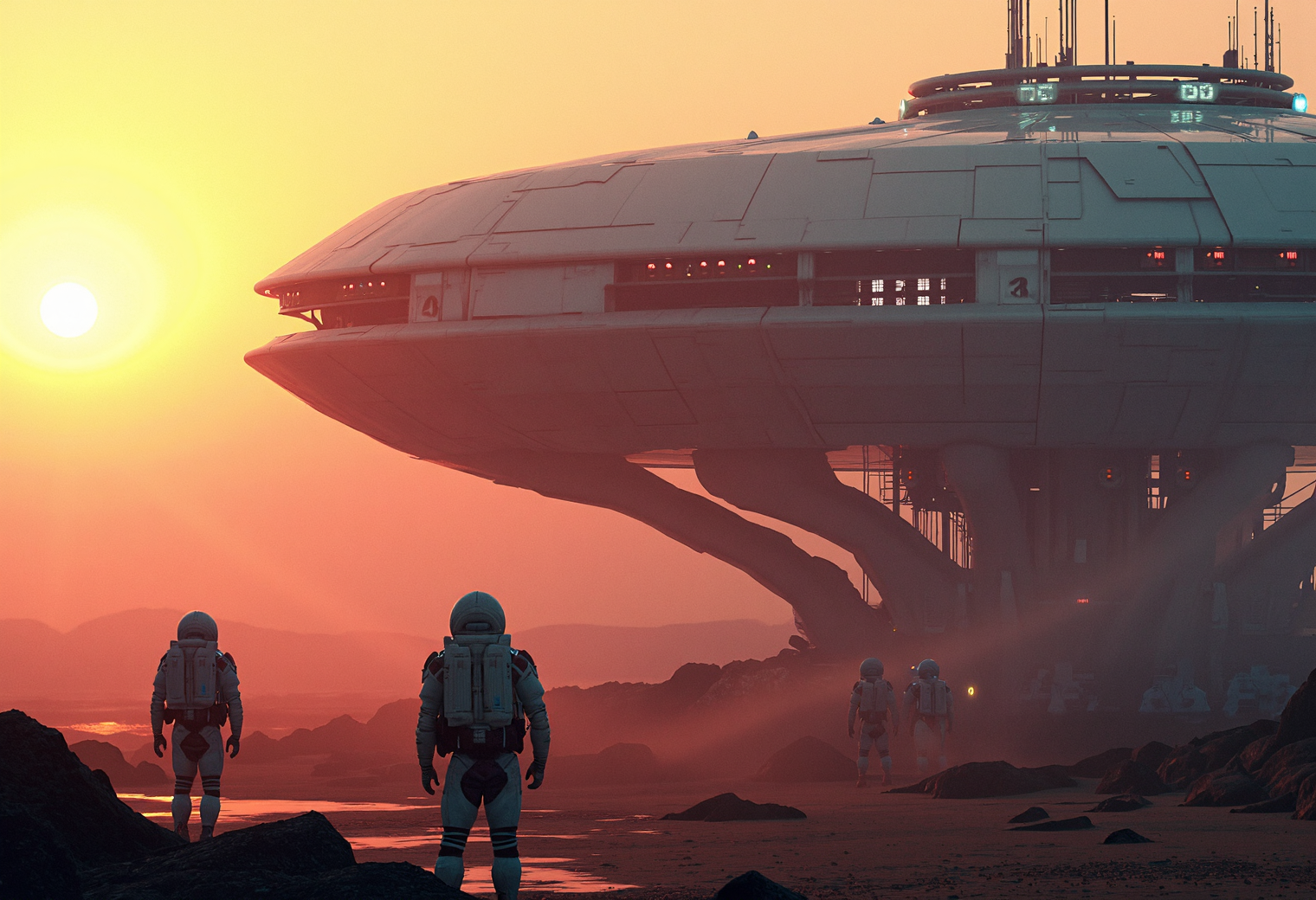 concept art, futuristic, a_skynet_cyberdyne_systems_craft, the image is featuring a fractal shaped Artemis Station spaceport megastructure of a Colossal scale in background, white ceramic and gleaming silver metallic surfaces glistening with condensation from the mist, red glowing diodes and lights, large depth of field, sunset, silhouetted, directional lighting, with scientists in spacesuits surrounding it UNI_SCI_FI_CORE