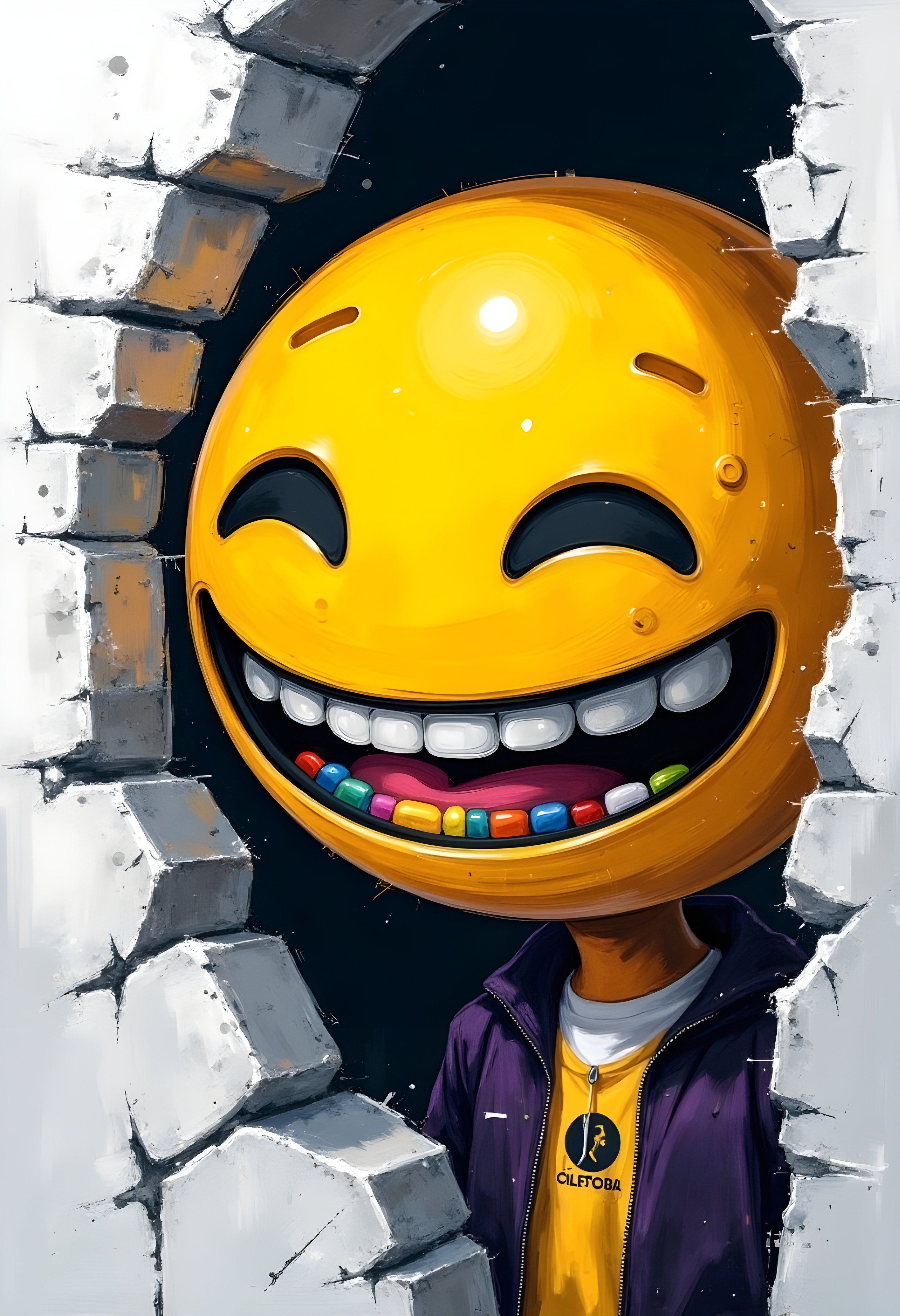 cinna flow, a figure with a yellow smiling emoji head with rainbow teeth filling their large smile. Wearing a cool swagger outfit. Peeking through a giant hole within a black and white wall. The figure was once in a colorless world, and now breaks free through the wall of endless colors. Wide amazed eyes.