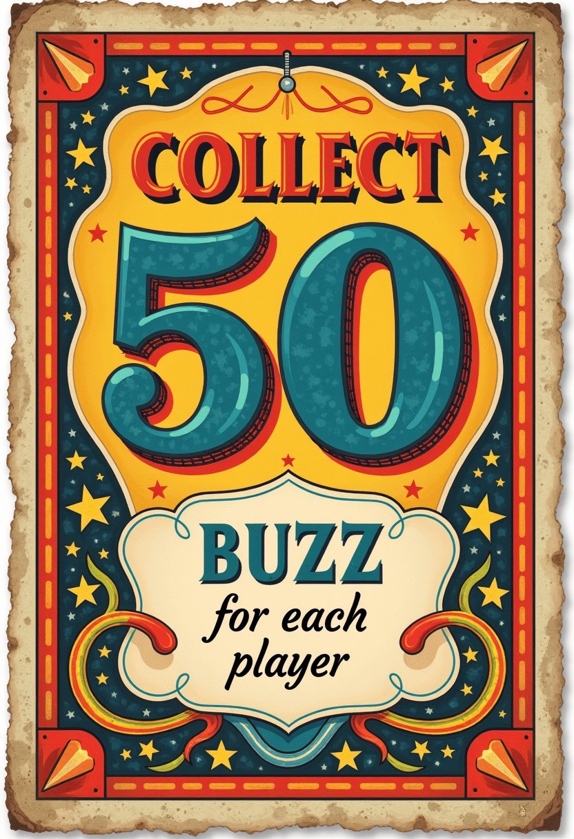 vintage Monopoly Chance card, (collect 50 buzz:1.5) from each player, colorful design, playful typography, classic board game style, (vibrant colors:1.2), detailed illustrations, nostalgic feel, high detail, whimsical, retro aesthetic.