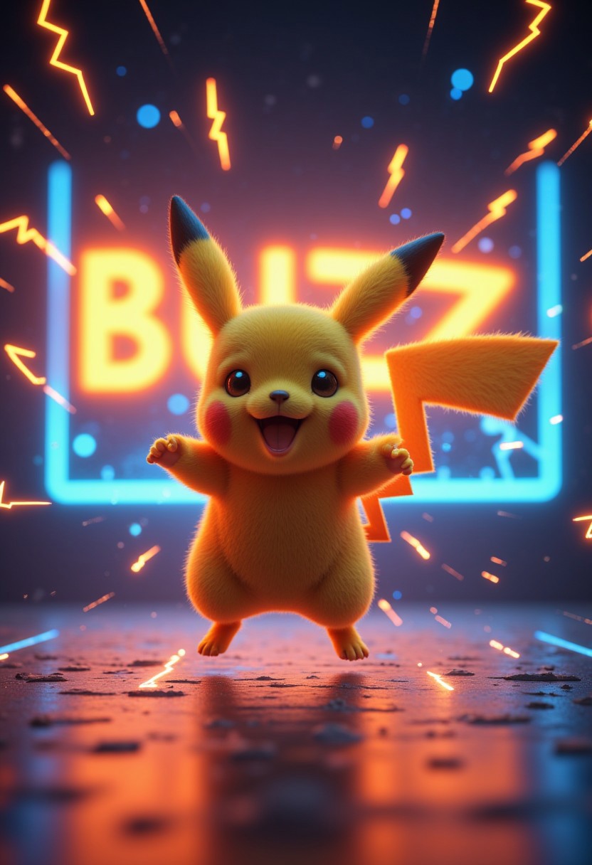anime, cyberpunk,A cute digital artwork of Pikachu playfully jumping in the air, surrounded by tiny glowing sparks of electric energy. The word "BUZZ" is faintly visible in the background, illuminated in bright orange and blue neon. The 3D rendering enhances Pikachu’s soft fur and expressive eyes.