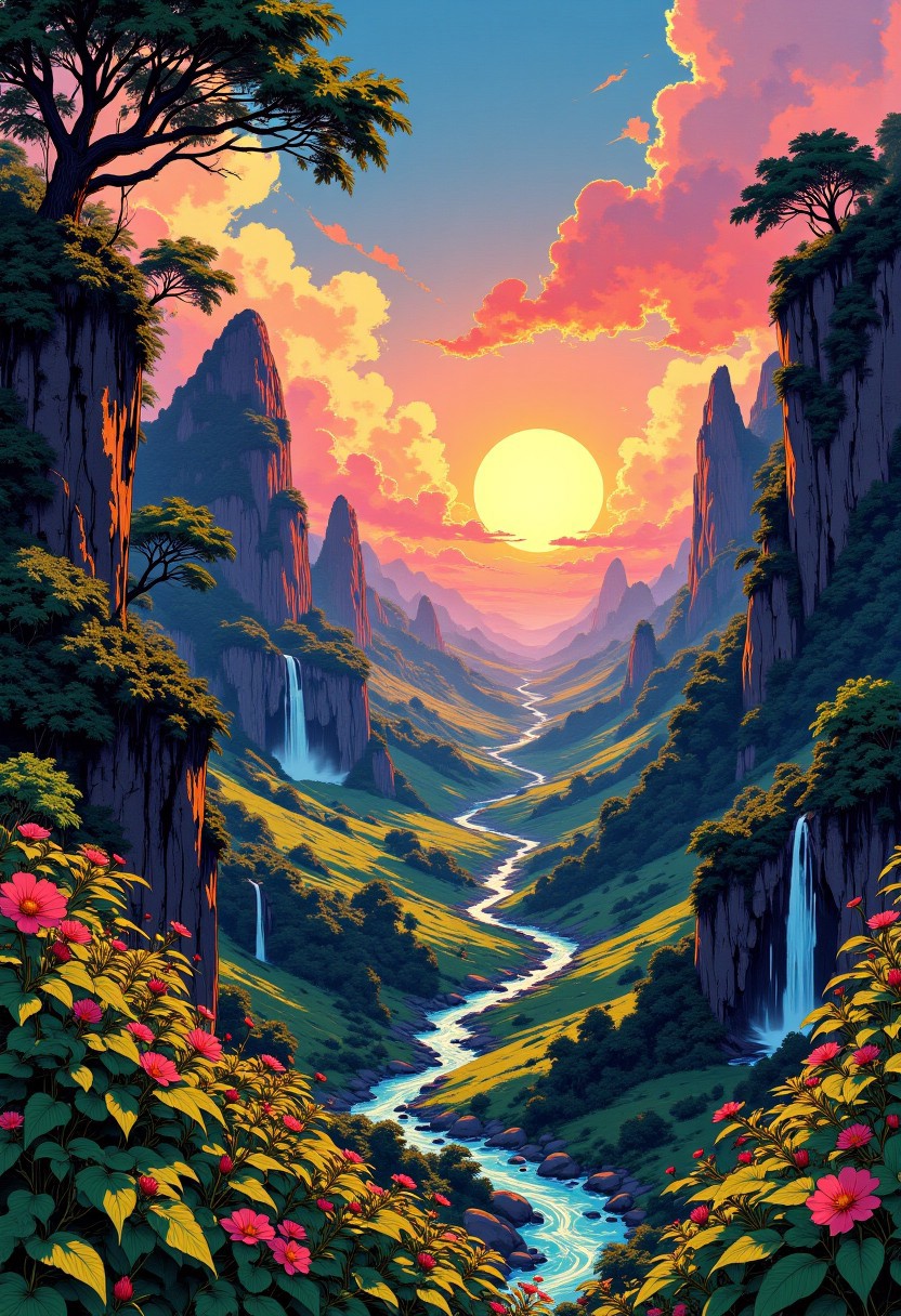 A breathtaking expanse of untamed jungle stretches as far as the eye can see, where towering plateaus rise like emerald fortresses, their sheer cliffs adorned with cascading vines and ancient trees clinging to the stone. From their mist-laden peaks, rivers of crystalline water spill down in luminous waterfalls, carving deep ravines through the lush undergrowth before winding their way into the heart of the jungle. The rivers snake through the land, cutting through the dense foliage and feeding vibrant, life-filled meadows nestled at the base of the towering plateaus. Here, the jungle thrives in harmonious chaos—colossal trees with sprawling canopies shelter an intricate web of life, while open plains of swaying grass provide a striking contrast to the dense greenery. The sky is an endless sea of deep azure, unmarred by clouds, allowing the golden sun to bathe the world in its warm glow. As twilight approaches, the heavens erupt in a breathtaking display of fiery hues, blending radiant gold, deep crimson, and soft lavender. The sun’s final rays glisten on the river’s surface, turning the waters into molten gold, while long shadows stretch across the jungle floor. The world feels alive, pulsing with an ancient rhythm, as the interplay of warm light and deep greens creates a vision of primal beauty, untouched by time. j_art.