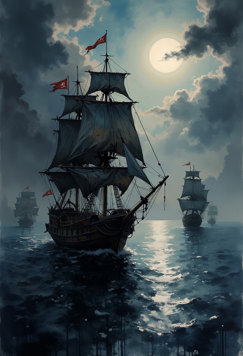 A dinkfsn style ink wash painting, pirate galleons on the open ocean, fR FROM LAND, silhouetted at night, dim moonlight, chiascuro