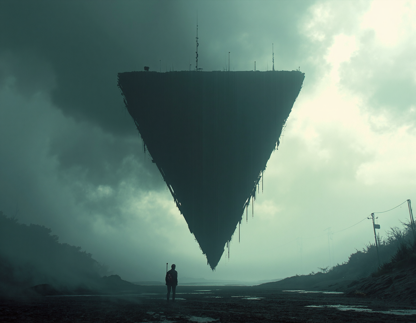 A haunting scene unfolds: a colossal inverted triangle pierces the clouds from a lone figure's vantage point at its base. The structure's dark surface absorbs light, exuding an oppressive presence as it appears to defy gravity. The lower point floats ominously amidst eerie mist, while sides disappear into hazy sky. UNI_SCI_FI_CORE