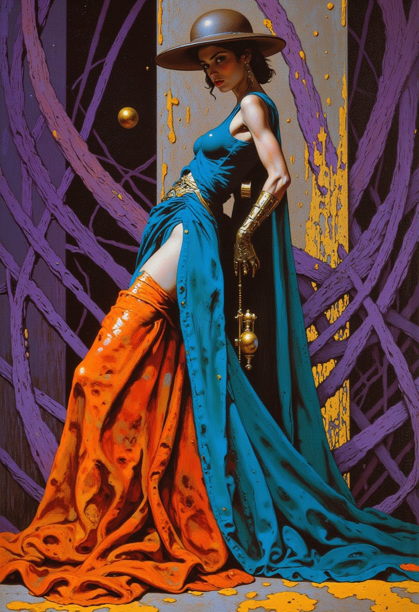 A stunning oil painting inspired by Wassily Kandinsky’s dynamic abstraction and Tamara de Lempicka’s refined elegance, depicting a striking woman with a statuesque, slender figure in a bold turquoise and fiery orange ensemble. Her wide-brimmed hat, a sculptural abstract form, extends in fluid, sweeping curves, partially obscuring her face and leaving only her sharply defined lips visible, evoking an air of mystery. She wears a flowing, electric blue dress with a sharply structured bodice and an asymmetrical skirt that cascades in angular folds, revealing glimpses of fiery orange lining. The dress’s vibrant hues create a dramatic interplay against her thigh-high, glossy burnt-orange boots that reflect ambient light. The structured yet flowing elements of her attire contrast with the rigid geometry of the background—an intricate network of deep purple and bright yellow intersecting lines forming dynamic, interwoven patterns, reminiscent of Kandinsky’s expressive compositions. The optical illusion of shifting depth and movement draws the eye toward the figure, enhancing the surreal, avant-garde aesthetic. Soft yet deliberate lighting sculpts the textures of fabric and skin, lending the painting a luminous, sculptural quality. The fusion of bold abstraction and refined elegance captures the essence of high fashion within a timeless, artistic vision.