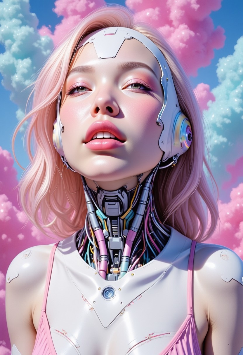 impressionist classical-style painting of a highly detailed, fantasy scene with a dramatic, robotic aesthetic. The central figure is a female robot. Her head and body are made of white, shiny and smooth metal with pastel-colored, exposed wiring going down her neck creating an organic mosaic pattern. She is a pastel, biomechanical robot and there are wires jacked into her face. Her eyes are an intense silver color with light silver eyeshadow, and her lips are a rich, deep pink pastel color. The background is a mix of explosions of powder and smoke in differing pastel colors. A spot light focuses on her from above. Her hair is metallic pastel colored strands that falls around the lower half of the image. She is blending in with the background. She is facing you and looking up into the sky intensely. The overall impression is one of dramatic beauty, with an almost otherworldly quality. (((ultra-realistic style))), realistic soft lighting, dark, eye-catching, atmospheric lighting, natural, shallow depth of field, (highlights: 0.8), high detail (dynamic, cinematic shot, film grain, bokeh, depth of field