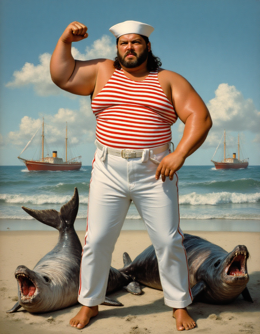 nautical-themed A portrait of Fred Ottman as Tugboat in a white sailor cap, standing triumphantly with his left arm raised in a powerful tugging gesture, the carcasses of his decimated marine mammal enemies lying at his feet. . sea, ocean, ships, maritime, beach, marine life, highly detailed