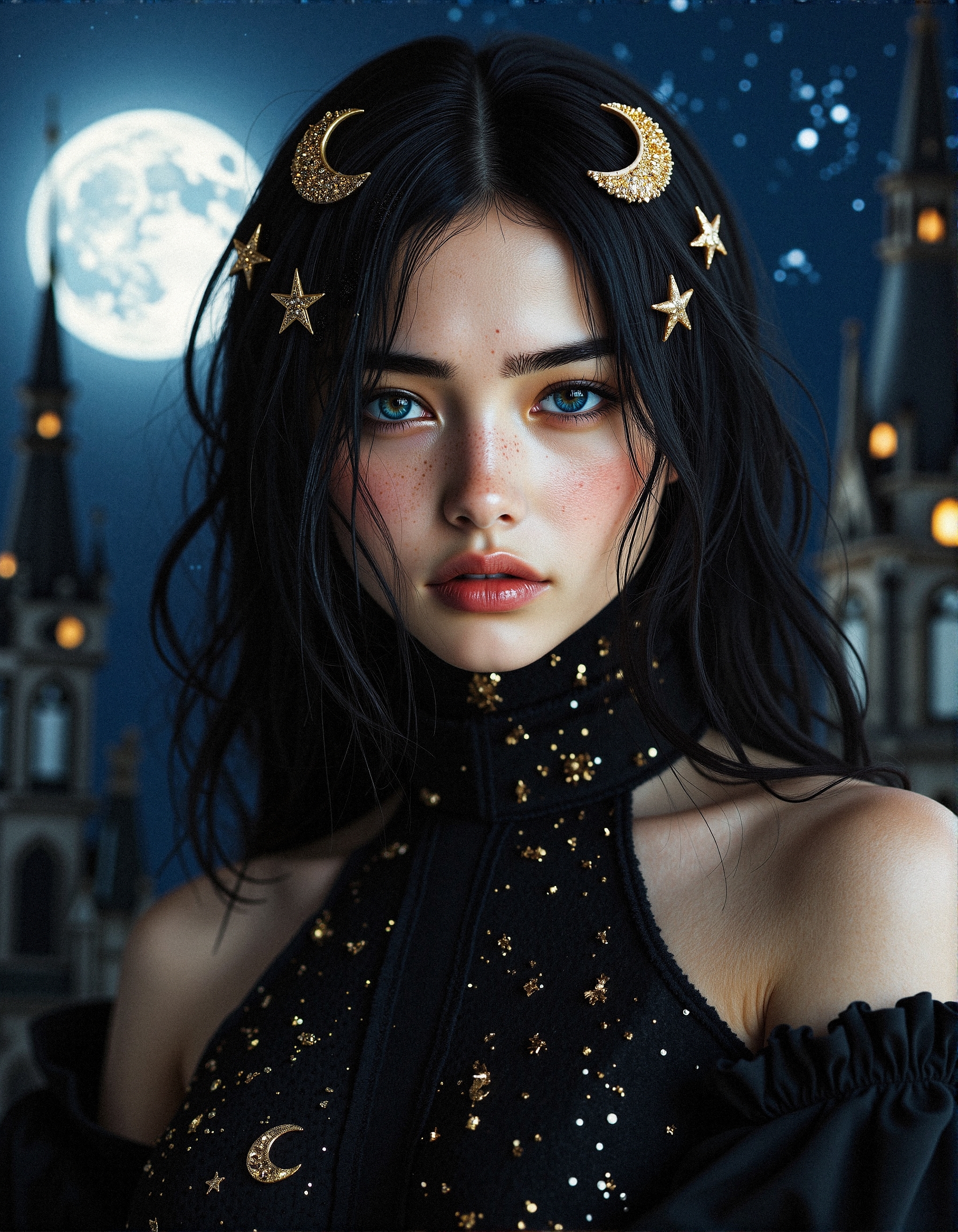 hyper-realisitic, hyper-detailed, detailed clothing, detailed foreground, RAW photo, detailed foreground, detailed clothing, detailed lighting, aidmaHyperrealism, aidmamj6.1, anatomically correct, curvy female, midjourney_whisper_innocent_eyes, dynamic pose, good looking woman, b34t5 A cinematic, lifelike portrait of a mysterious woman under a celestial night sky. Her luxurious black gown, adorned with delicate gold constellations and glittering star-like sequins, appears to float in the cool evening air. Her jet-black hair flows naturally, accented with golden hairpieces resembling crescent moons. Her face, illuminated by the moonlight, features vivid blue eyes filled with depth and emotion. Behind her, the intricate spires of a gothic castle and the glowing moon create a rich, photorealistic backdrop, enhanced by the shimmering stars scattered across the dark sky. <lora:FluxDFaeTasticDetails:0.2> <lora:midjourney_whisper_innocent_eyes_v01:0.8>