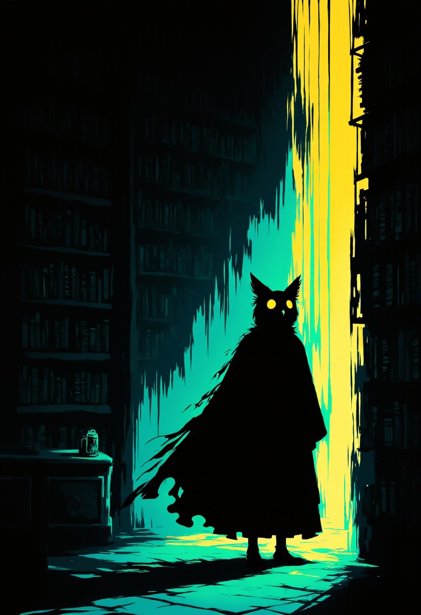 digital oil painting using harsh paint strokes, predominantly black background with dystopian and glitch elements, flat colors, unique silhouette design, minimalist style painting, teal and gold color theme, mature, featuring an anthro owl imperial scholar walking past a long bookshelf in an ancient magical library in a fantasy setting, the library is illuminated by night pearls and will o' wisps trapped in hanging glass jars, low angle