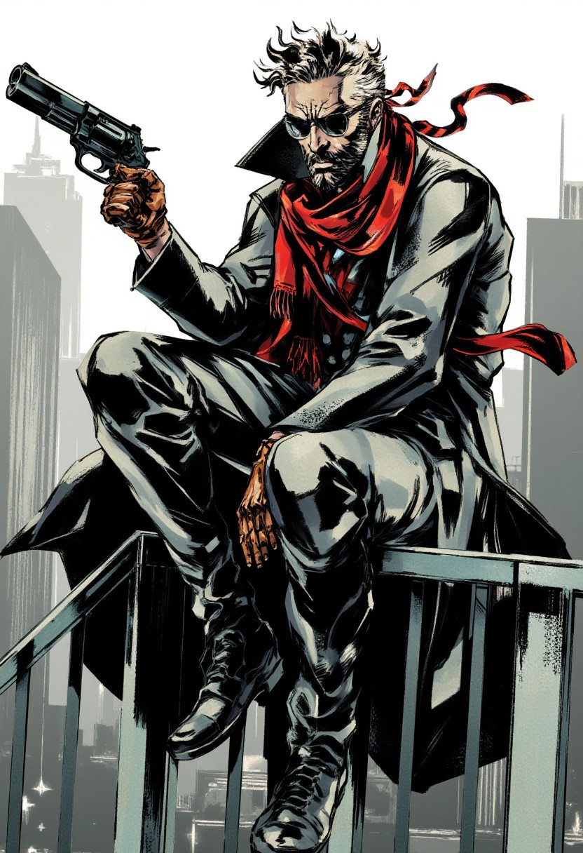 Stylized digital illustration with a yshinkawa cyberpunk aesthetic, showcasing a badass vigilante with crazy hair, wearing a slick trench coat, an extremely long scarf, a headband and round shades. He sits crouching on a railing, holding a large six-shooter revolver gun. The background is dystopian looking urban area