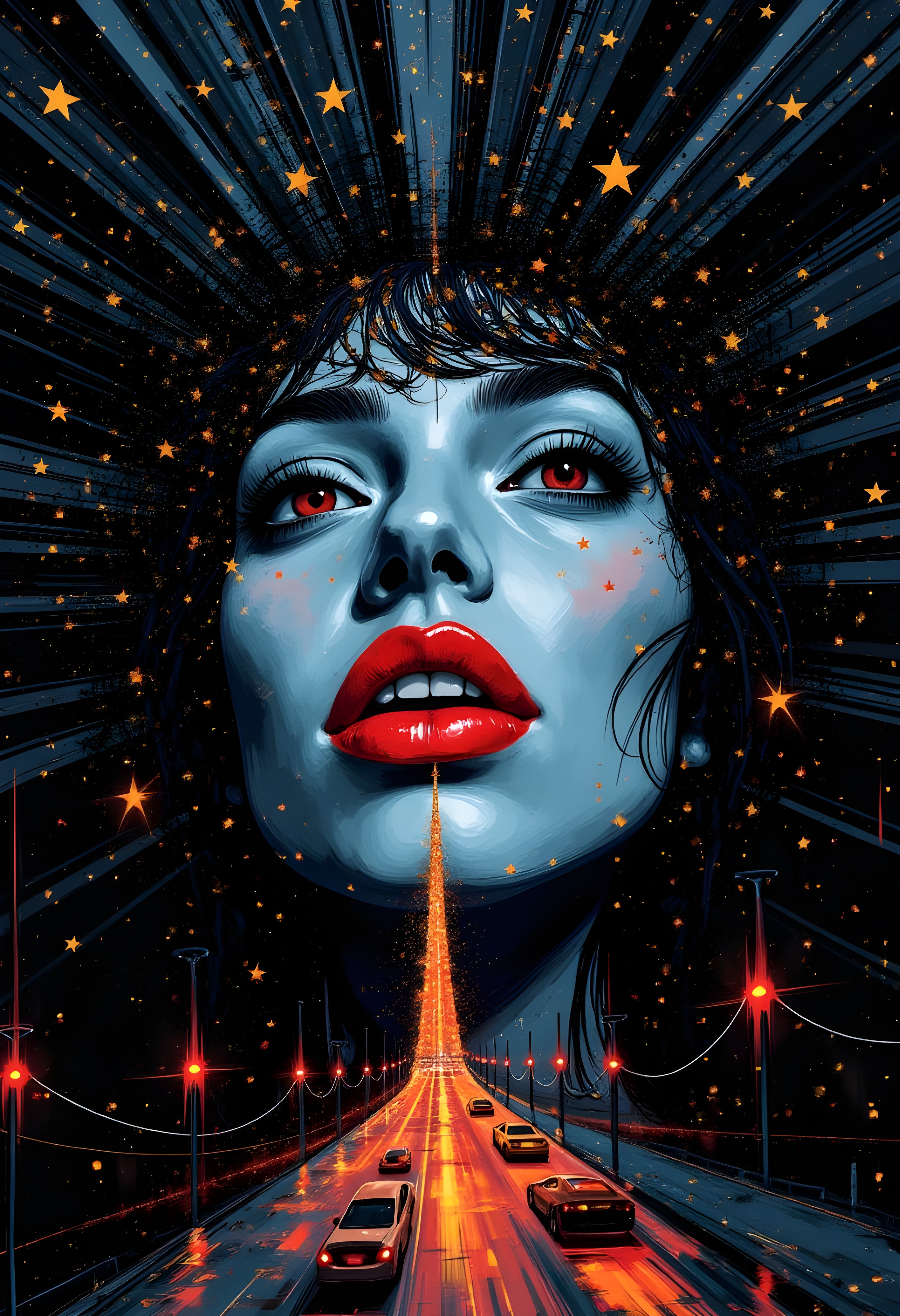 cinna flow, graphic illustration, in the style of pop art bold and graphic imagery, black and white block prints with some light orange and light blue. Face with lips. Lipstick design inspired by Vincent van gogh's starry night painting. Star pupils. Hair transformed into trees and flowers park. Lost in a high-resolution vortex of city lights and side walks all converging into a single point.