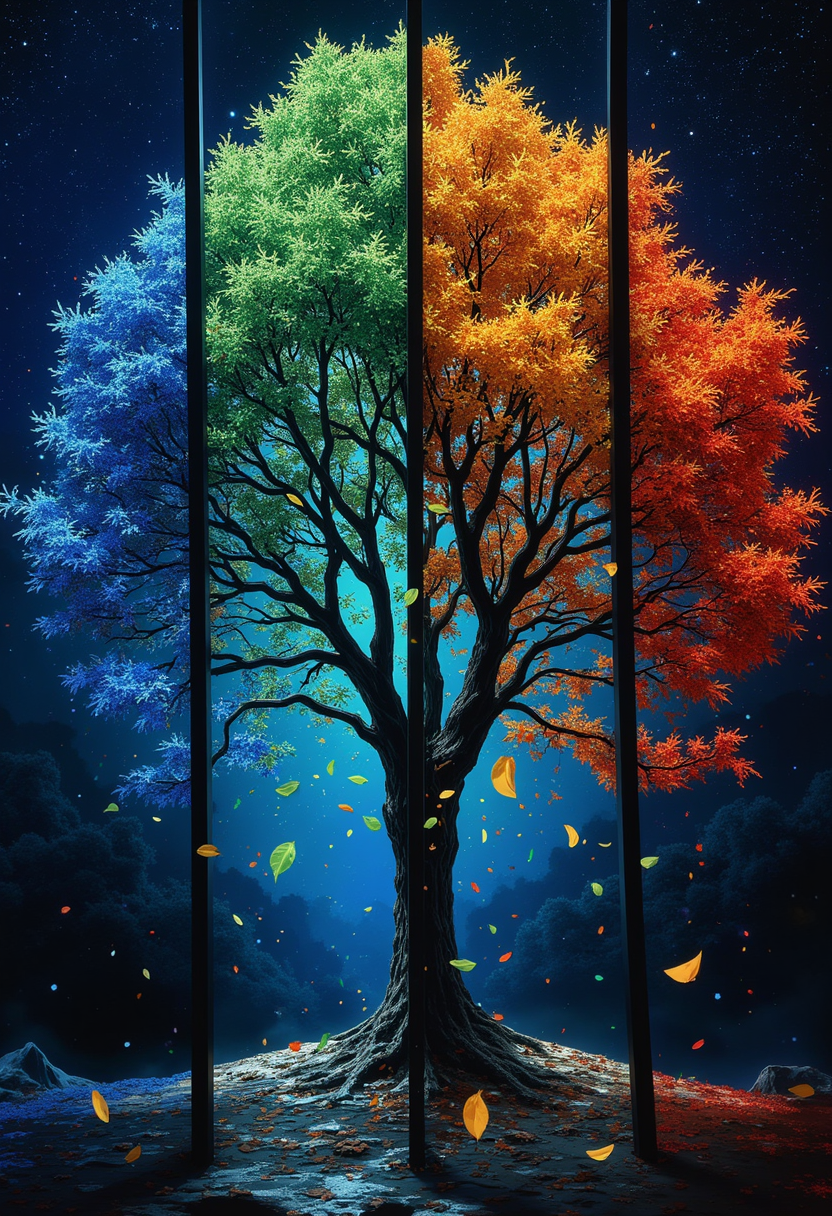 Cyberpunk, retrofuturism. A tall fantasy art panel divided into four vertical sections, each showing the same stylized tree in a different season: - Left section: winter theme with vibrant icy-blue leaves, snowflakes, and a dark starry sky - Second section: spring theme with bright green leaves, soft glow, and gentle sparkles - Third section: summer theme with warm golden-orange leaves, light glow, and shimmering atmosphere - Right section: autumn theme with fiery red leaves, falling foliage, and a darker star-filled sky Each section seamlessly transitions in color and mood, leaves softly glowing and drifting, intricate detail, ultra-detailed, fantasy lighting, digital painting, trending on ArtStation, 8k resolution. The overall composition feels timeless, as if capturing the essence of purity and perfection, with a soft, dreamlike quality that invites introspection and awe. The simplicity of the image enhances its mystique, creating a profound, angelic presence that feels both familiar and otherworldly..,, best quality, medium-format camera, high-contrast, spectacular lighting., striking composition, the overall composition seems cinematic. , Otherworldly atmosphere. aidmamj6.1 (Depth of field), low saturation,detail. mythp0rt Stylish, charismatic.c. (Depth of field),,detail. mythp0rt Stylish, charismatic. ,aidmamj6.1,ne0nfant4sy,. <lora:domiswaunfluxmini:1>
