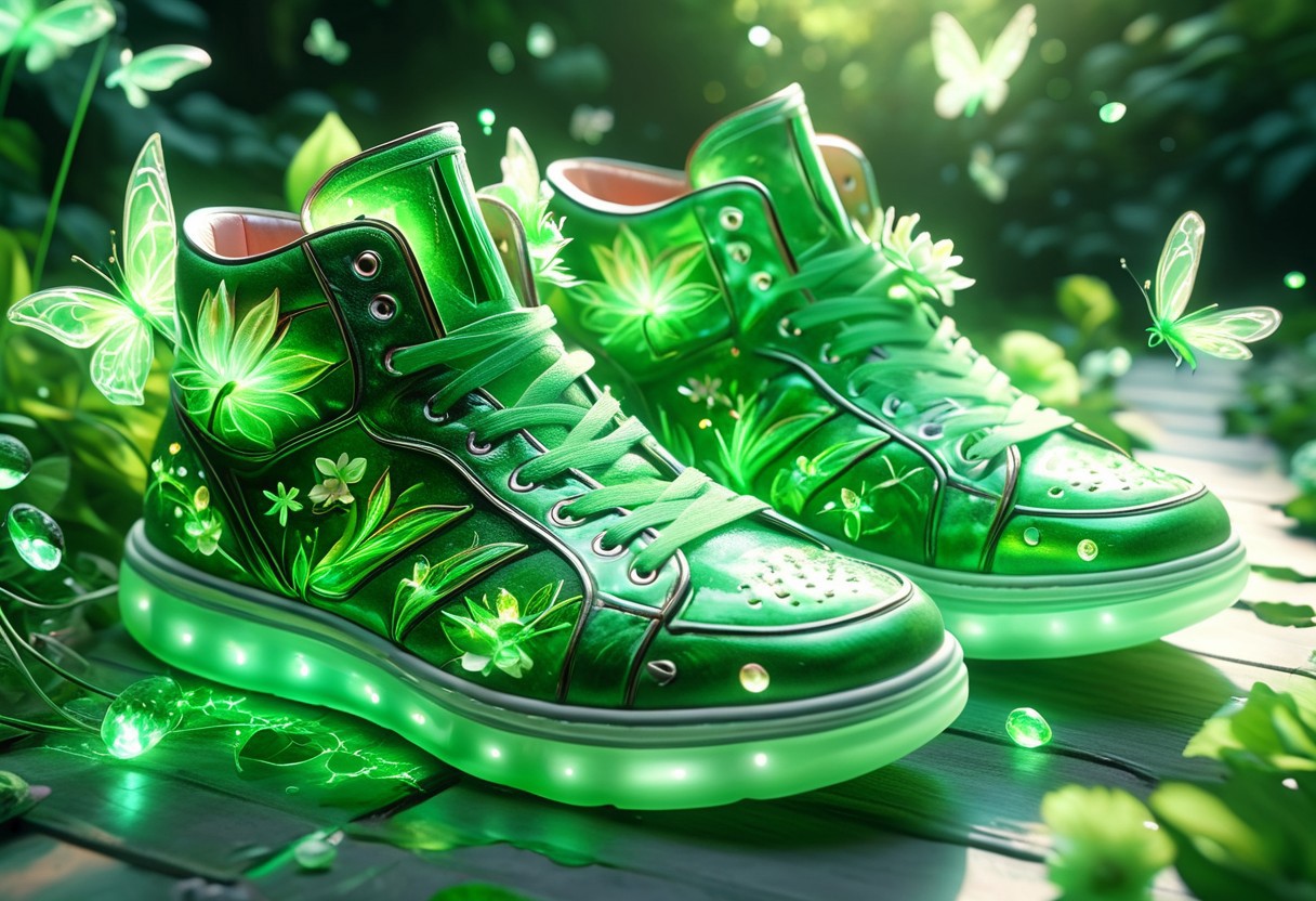 8k, score_9, score_8_up, score_7_up, masterpiece,realistic,ultra detailed, vibrant colors,photo-realistic, sneakers, greenery, blooming flowers, floating plants, magic, green magical energy, elemental magic, green color scheme, sunshine, magical atmosphere,