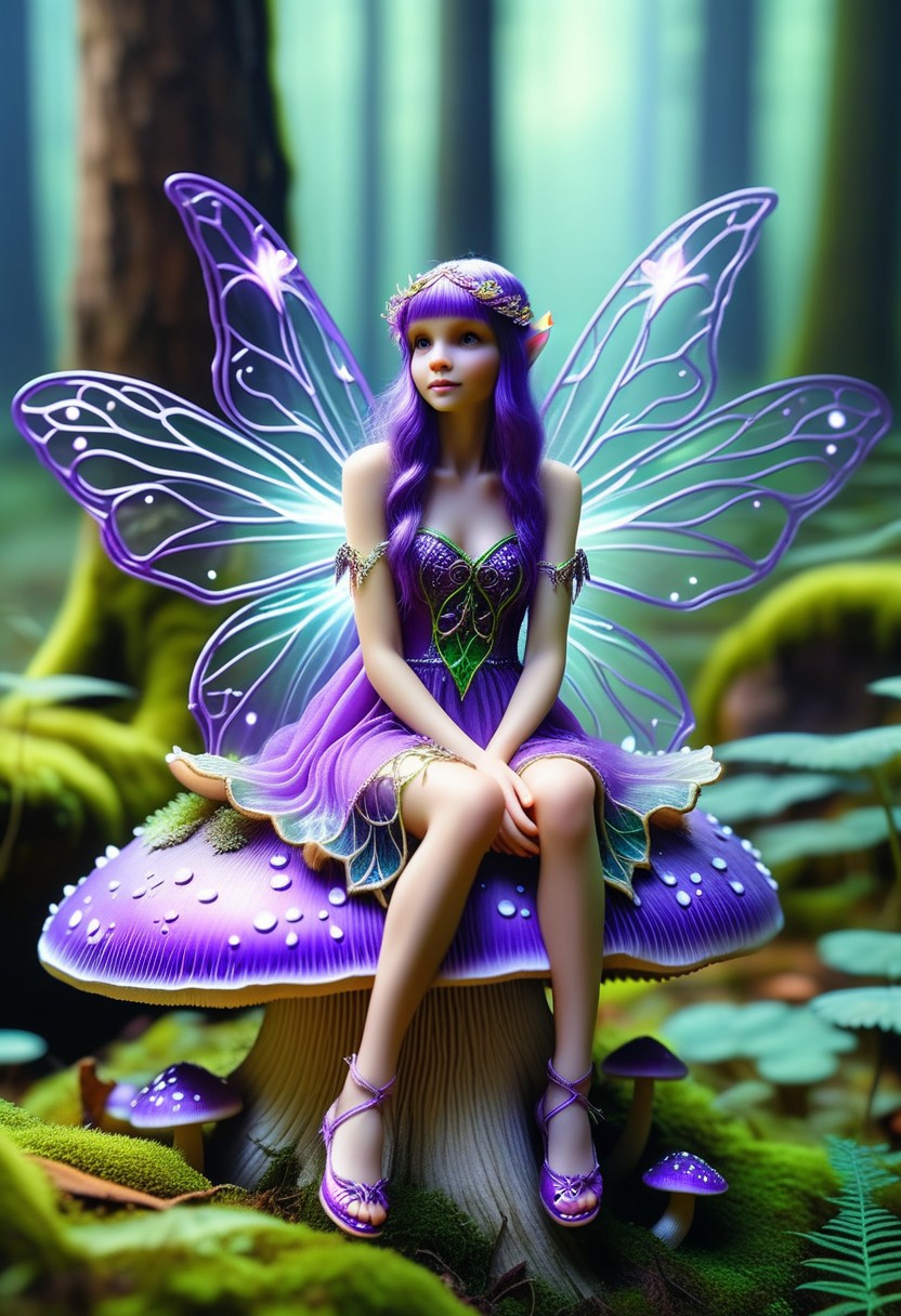 DonM3lv3sXL, Close up of tiny fairy sitting on a mushroom, purple fantasy dress, forest background, vibrant, photography, high quality, detailed, realistic