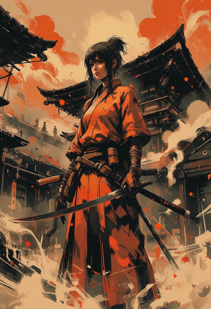 in the style of ck-mgs, nistyle, Special Ink-drawing mode, intricate linework with expressive contrasts, Inkplash art on rice paper, sepia, henna , Silhouette Art, magnificent, inksplash image of samurai warrior female elf standing in front of shinto shrine, holds a katana in his hands