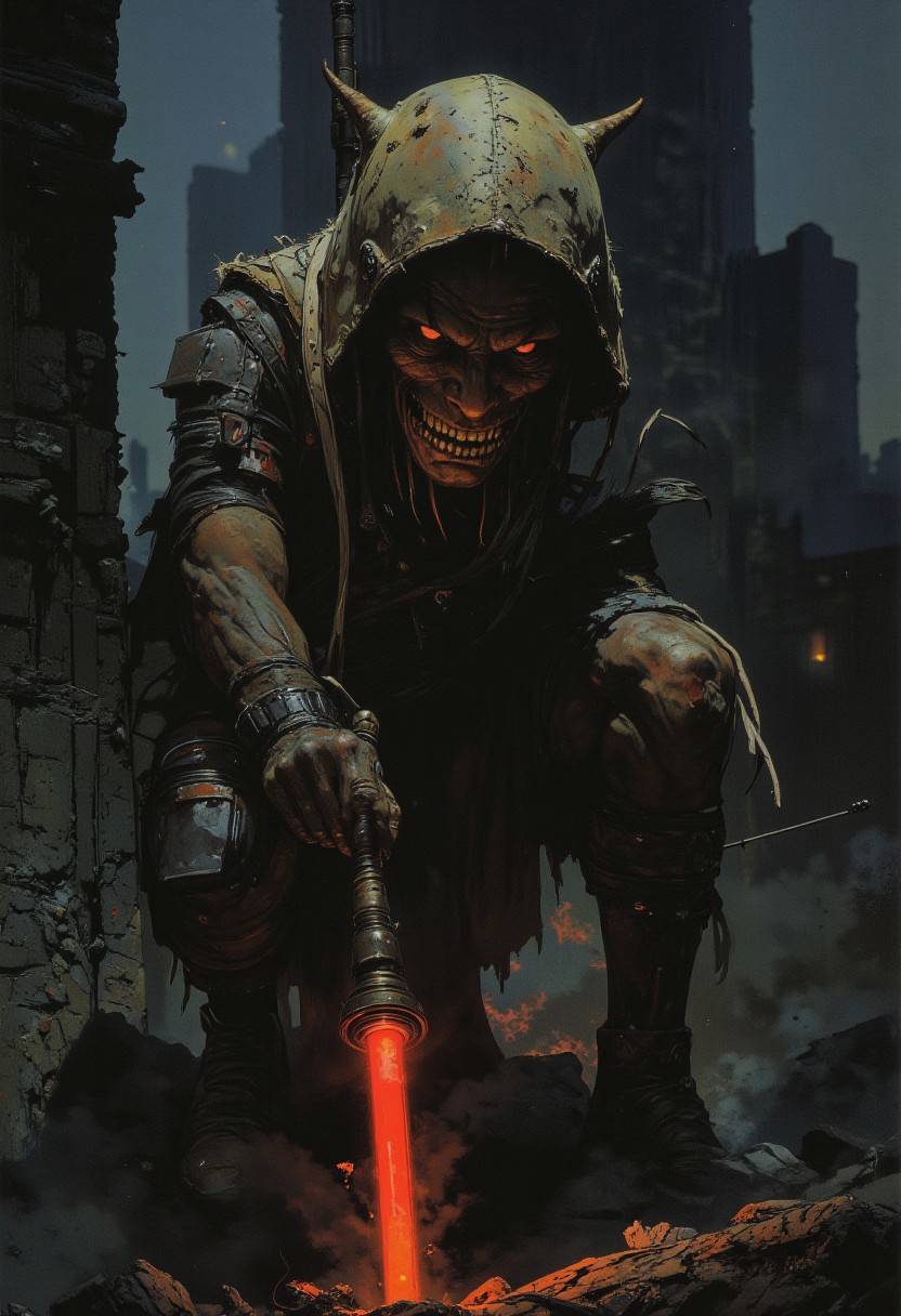 Digital artwork, Kaito Ren style, A dark, moody digital illustration depicting a menacing, otherworldly figure. This humanoid creature has a distorted, inhuman face, adorned with a large, toothy grin that reveals sharp, pointed teeth. Its glowing red eyes pierce through the darkness, exuding a sinister presence. Long, flowing white hair, tied back with a tattered cloth, cascades from beneath a weathered straw hat with frayed edges. Draped in rugged, ancient warrior’s attire, the figure’s armor is a fusion of heavy, textured materials—metal plates and aged leather, each adorned with intricate designs and rivets. Instead of a sword and candle, the creature clutches a massive flashlight emitting an intense red beam. This haunting glow slices through the shadows, illuminating the scene in an eerie, foreboding light. Blurred, ominous ruins loom in the distance, their decayed forms shrouded in twilight blue hues, suggesting the fading light of dusk or the eerie quiet of dawn. The composition, rich in texture and depth, draws the viewer into a world of mystery and dread, where the unknown lingers just beyond the red-lit abyss.