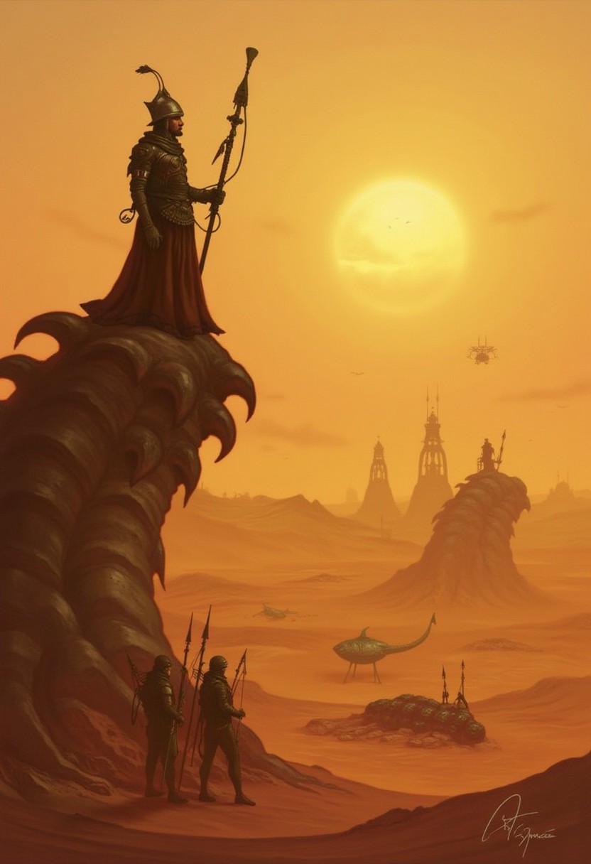 A majestic stillsuit-clad figure, Paul Atreides, stands atop a towering sandworm's vertebrae, gazing out upon the endless dunes of Arrakis. The setting sun casts a warm orange glow, as the Fremen warrior's eyes burn with determination. In the distance, the ornithopter fleet glides across the horizon, while the towering Sardaukar soldiers stand watchfully below. A lone Gom Jabbar stingray glints in the fading light.