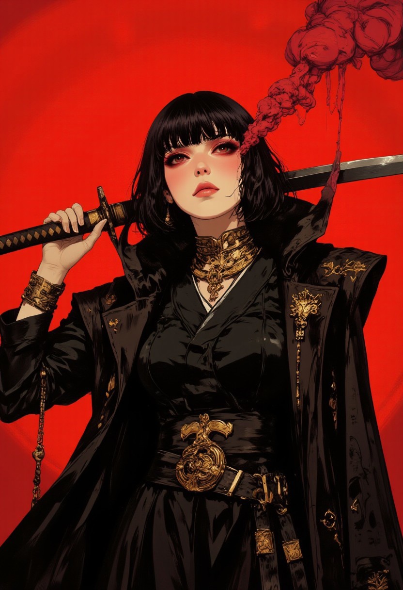 A hyper-detailed anime artwork of JunjiIto.hanna, featuring short black hair styled in a floating French bob cut, exuding an ethereal and unsettling presence. She is adorned with intricate, Egyptian-inspired golden ornaments and avant-garde clothing, crafted with meticulous digital inking and textured shading in Clip Studio Paint, capturing a chilling, cinematic atmosphere. Her long, dark bangs partially obscure her hollow, pupil-less eyes, which gaze upward with an intense, vacant stare. She wears a traditional Japanese school uniform, layered beneath an oversized dark overcoat, adding a sense of mystery and foreboding. In mid-motion, she draws a gleaming katana, with droplets and fine crimson mist elegantly arcing outward from the blade, suggesting intense movement without revealing its source. The crimson mist sharply contrasts against a deep red gradient background, heightening the eerie, surreal ambiance. Shot from a high-angle perspective, enhanced by a 100mm virtual prime lens with an f/2.8 aperture for a shallow depth of field and ISO 50 for ultra-fine clarity, the composition emphasizes her otherworldly presence. The red-to-black gradient background amplifies the unsettling effect, with dramatic shadows and fine grain adding texture. Inspired by Junji Ito’s distinctive unsettling style, the piece captures a moment frozen in time, enveloped in dreadful suspense. (in the style of cksc,, fantasy painting)