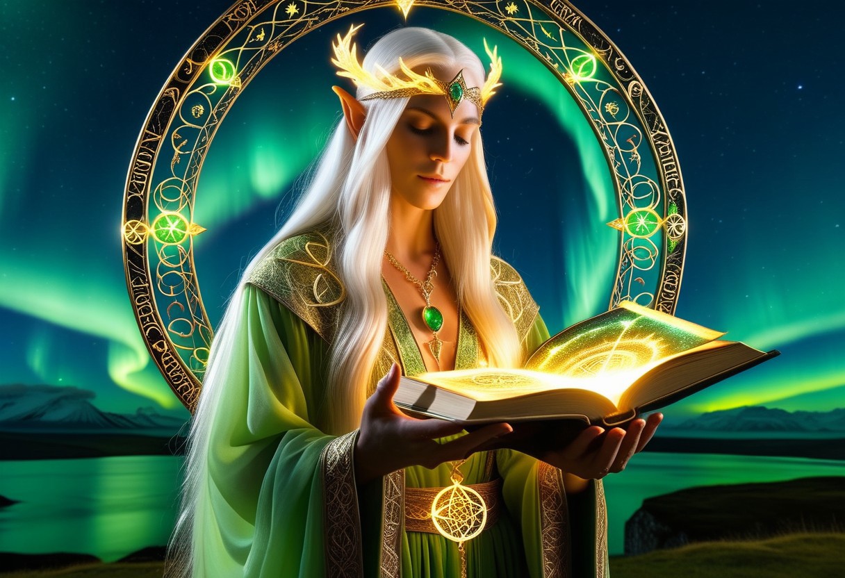 masterpiece, best quality, amazing quality, very aesthetic, absurdres, newest, ethereal elven oracle, wearing an intricate robe woven with cosmic threads, adorned with golden celestial symbols, floating above an ancient stone circle, glowing runes forming a protective barrier, long flowing silver hair, blindfolded but seeing through magic, multiple enchanted rings glowing on fingers, soft golden light radiating from hands, aurora borealis in the sky, intricate ceremonial jewelry, floating spellbook with celestial writings, DonM3lv3sXL,