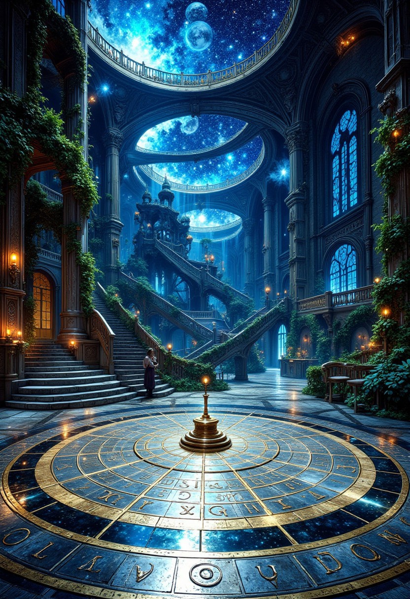 The Celestial Engine of the Forgotten Heavens A massive ballroom suspended within the heart of an ancient celestial machine, where endless brass cogs and glowing astrolabes turn silently. Glass vines, filled with pulsing blue stardust, coil around the framework, casting shifting reflections of a lost world beyond the stars. The floor, made of engraved silver metal, pulses with strange runes that glow in time with the beating of an unseen cosmic heart. The scent of starlit ink, arcane electricity, and something on the verge of awakening fills the air.