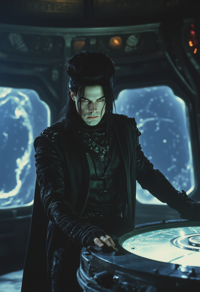 dark fantasy aesthetic. ,A mature man in dark cyberpunk clothes stands in the control room of a spaceship, large portholes, black space and stars outside. A large control panel, pressing the control knobs, concentrated gaze, black hair, long sweater sleeves. An otherworldly atmosphere. (Depth of field), low saturation,detail. mythp0rt Stylish, charismatic. ,. masterpiece, ,KNRm, , Otherworldly atmosphere. aidmamj6.1 (Depth of field), low saturation,detail. mythp0rt, Stylish, charismatic.. ArsMovieStill, 80s Fantasy Movie Still, (Depth of field), low saturation,detail. mythp0rt Stylish, charismatic. (depth of field) mythp0rt, nigiex.