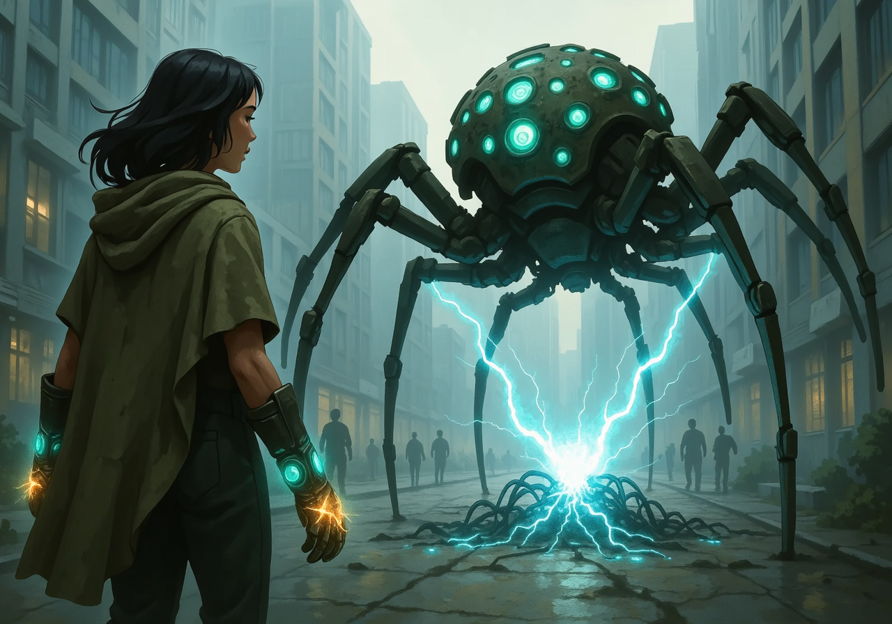 painterly style with soft cel-shaded lighting and detailed stylized rendering of A Latina woman in a tattered cloak and glowing gauntlets walks through a dense cyberpunk city, her steps silent despite the bustling streets around her. A massive creature, resembling a cross between a spider and a centipede with a dozen glowing eyes, stalks her from the shadows. Suddenly, the woman turns, her gauntlets sparking with energy, and with a quick thrust of her hand, she releases a pulse of electricity, frying the creatureâs circuits. Its metallic legs twitch uncontrollably before it collapses into a heap of wires and broken limbs.<lora:story_game_art.safetensors:1.0:1.0>