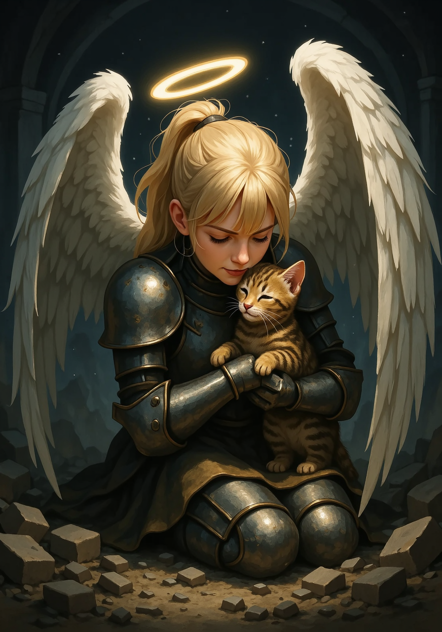 painterly style with soft cel-shaded lighting and detailed stylized rendering of a young woman blonde female angel with large furled wings and a halo above her head, wearing ornate gothic armor, pitch black night the only light from her emanating from her halo, cradling a content tabby kitten, she has her eyes closed and is pressing her cheek into the kitten's cheek, with a slight smile, she is in her early twenties and has an innocent face, in a collapsed chapel with caved in ceiling, kneeling, depth of field, ambient lighting, dust particles, ponytail with bangs, the scene shoes a moment of warmth in an otherwise grim and destroyed setting, The painting technique in this image is characterized by a highly detailed and realistic style, emphasizing fine textures and subtle gradations of light and shadow to create a three-dimensional effect. The artist has employed smooth brushwork to render the softness of the angelâÂÂs blonde hair, contrasting with the meticulous depiction of the armorâÂÂs metallic sheen and weathered surface, complete with scratches and dents that suggest a history of use. The feathers of the wings are individually defined, with varying tones that give them volume and a fluffy appearance. There is also an attention to detail in the portrayal of the catâÂÂs fur pattern, where each strand seems discernible, adding to the lifelike quality of the scene. The background is composed mostly of dark tones, enhancing the illumination around the angelâÂÂs halo and highlights on her armor, creating a dramatic atmosphere. Additionally, there is an effective use of chiaroscuroâÂÂthe contrast between light and darkâÂÂto draw attention to certain elements like the angelâÂÂs face (which has been obscured for privacy) and her interaction with the cat. This technique also emphasizes depth in areas such as where rubble is scattered around them. The image shows an angel in armor sitting amidst rubble while holding a cat, blending celestial imagery with earthly destruction, suggesting themes of protection or solace amidst chaos.<lora:story_game_art.safetensors:1.0:1.0>