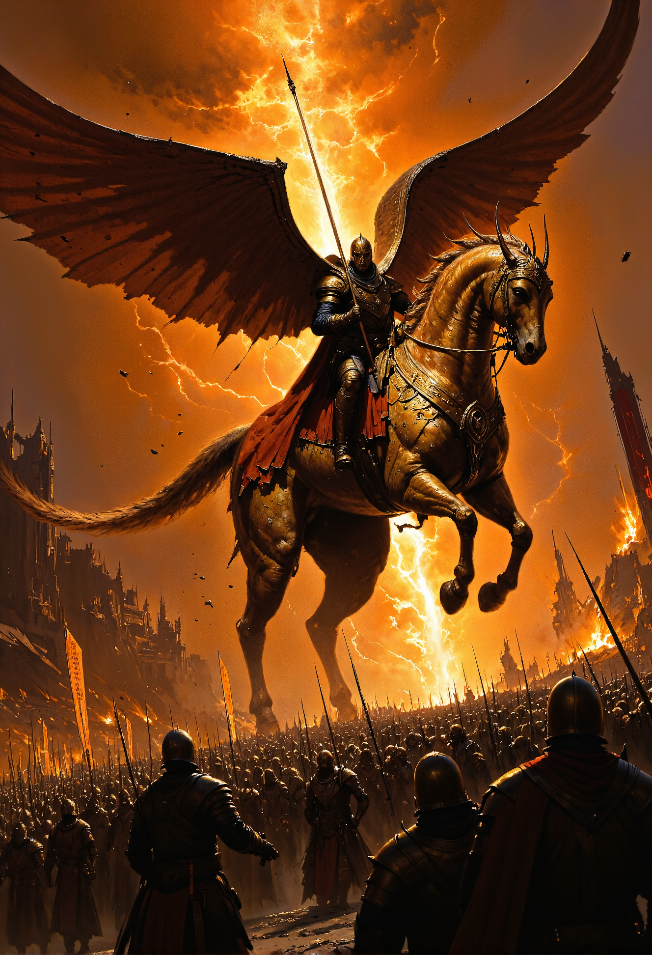 An epic medieval battle scene illuminated by the fiery glow of a blazing sunset. A fearless warrior clad in dark, ornate armor sits atop a massive, dragon-like steed covered in shimmering golden scales. The warriorâs crimson cape billows dramatically in the wind, while his helmet gleams faintly, partially revealing a face set with fierce determination. He holds a long, menacing lance at the ready as his steed rears back on its hind legs, roaring in defiance. In the foreground, a group of enemy soldiers, dressed in rugged, battle-worn armor, raises their spears and halberds, preparing to strike. The chaotic battlefield stretches into the background, shrouded in smoke and fire, where the faint silhouettes of clashing armies and blazing torches light up the haze. The dynamic interplay of light and shadow creates dramatic contrast, with the warrior and his steed prominently highlighted against the dim chaos. The composition emphasizes movement, tension, and the overwhelming intensity of war. The scene is alive with gritty, immersive details: sparks flying from weapons, dirt swirling in the air, and the glow of burning banners in the distance. A sense of grandeur and peril dominates, evoking the timeless struggle between heroism and overwhelming odds. <lora:flux.1_lora_flyway_Epic-Characters_v1.safetensors:1.0>, <lora:Warhammer_Rogue_Trader_Style_flux-000021.safetensors:0.5>, <lora:artisketchyfs-v02.safetensors:0.75>,