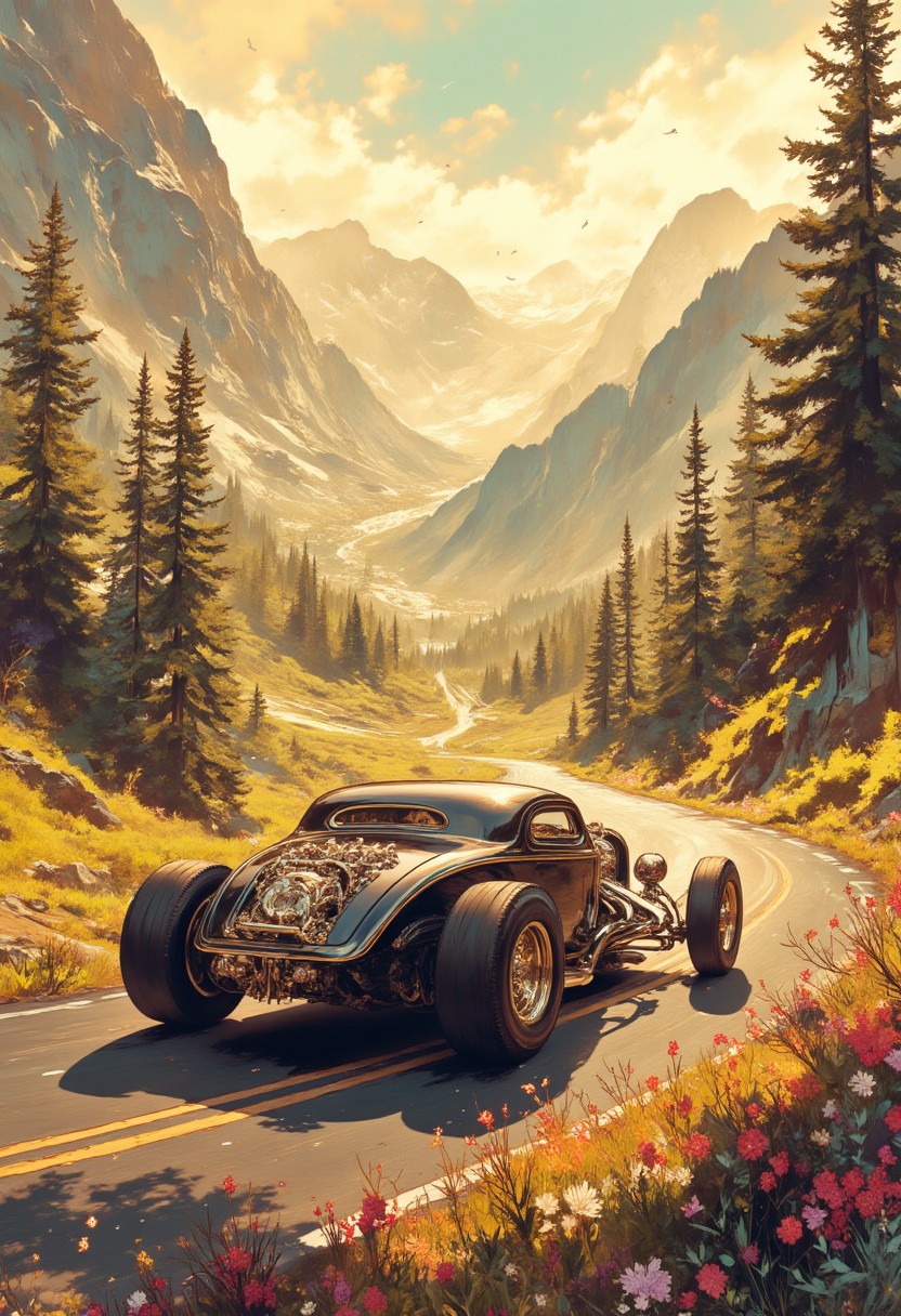 In the style of ff-td, the sleek hot rod stands alone on a winding asphalt road, its polished chrome gleaming under a golden sun. The powerful engine roars softly in the distance, a deep, resonant growl that echoes through the lush valley below. Towering pines surround it, their needles carpeting the forest floor, while vibrant wildflowers sway gently in the breeze. The open expanse stretches endlessly, where nature thrives untouched, and only the beastly machine stands as a silent testament to human ingenuity, perfectly at one with its untamed surroundings.