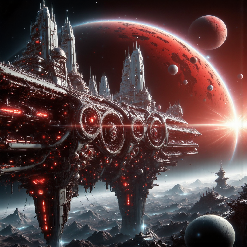 This is a highly detailed, the year 2500 In the cold darkness of outer space (the main focus,an enormous space station,enhanced close view to show size) sits at the edge of uncharted territories, orbiting a red star with (the star's harsh red light tinting everything it touches). As we approach the station, (it's size starts to become apparent with decks extending up and extending down as far as we can see) before curving inward out of site. This space station is an enormous city floating in space, made up of living quarters, shopping, entertainment, all the things you expect to see in a city. It is easy to distinguish between the new sections and the older parts, many having different designs giving a YFG-Sm0rg schizophrenic look to the station. It's main attraction are the repair bays capable of working on the smallest to the largest ships. Many ships can be seen being pulled in with electrified tractor beams while others are docked to the station or sit further out. nebula, galaxy, spectacular, Interstellar, Energy light particle, drifting in deep space. 4k, high-detail hyper-realism, HD quality, high-detail masterpiece great lighting, clear, space-station, <lora:Eldritch_Sci-Fi-Flux:0.5> <lora:YFG-Smorgas-v1-flux:1> <lora:Electrified_Flux_v1:0.85>