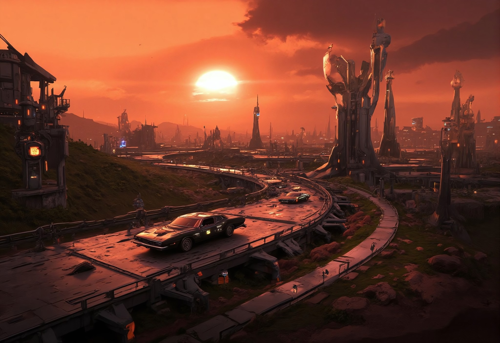Futuristic cityscape at sunset. A sleek hovercar cruises along a winding road towards a distant metropolis. Neon lights glow vibrantly against the warm, orange sky. The landscape is dotted with remnants of an ancient civilization - crumbling statues and overgrown ruins. The scene blends advanced technology with forgotten history. Hyper-realistic style with dramatic lighting and atmospheric perspective, anime, cyberpunk