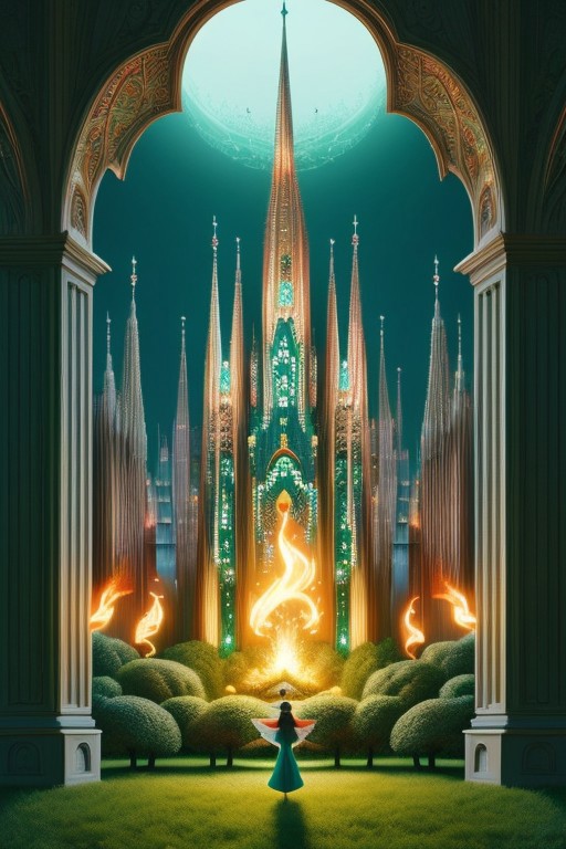 DonM3lv3s, A mystical temple glowing with ethereal light, whimsical illustration, bold color palette, mid-century modern design, stylized shapes, childlike wonder, flat perspective, playful composition, simplified forms, decorative patterns, fairy tale charm, vibrant color blocking, storybook aesthetic, expressive characters, graphic stylization, joyful mood, folk art influence, imaginative scenery, visual rhythm, retro fantasy, illustrative modernism