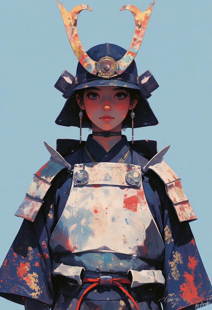 This image is a highly detailed photograph depicting a samurai warrior, rendered in a traditional Japanese style. The samurai is dressed in a full set of armor, consisting of a layered, intricate outfit. The armor includes a white, textured breastplate with intricate patterns and a large, ornate helmet adorned with red and blue designs. The helmet has two large, curved, black horns with intricate patterns and a red, swirling design at the top. The samurai's face is partially obscured by the helmet, but their serene expression suggests a calm, focused demeanor. The samurai's attire also features a richly patterned, dark blue kimono with a geometric honeycomb design and a red sash tied around the waist, adding to the traditional aesthetic. The background is a soft sky blue, which complements the vivid colors of the armor, making the warrior stand out even more as the focal point. The textures of the armor are meticulously detailed, showcasing the intricate patterns and folds, giving a sense of depth and realism. The overall composition is balanced and harmonious, emphasizing the warrior's strength and dignity through their attire and posture.
