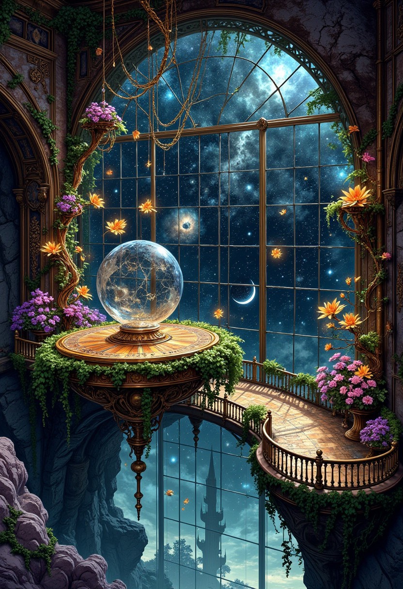 The Luminous Clockwork Celestarium A floating, gravity-defying ballroom, its glass walls revealing the shifting tapestry of space beyond. Mechanical vines adorned with glowing, metallic blossoms coil around floating astrolabes, their petals opening and closing with each passing hour. The ornate brass balcony extends into open space, offering views of distant cosmic storms and swirling nebulae. The scent of cool stardust, moonlit violets, and golden incense lingers, evoking a feeling of infinite exploration and celestial wonder.