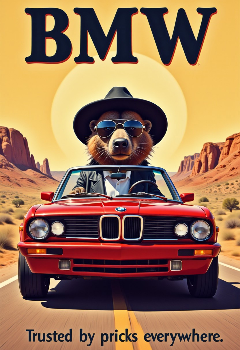 rtropopCE, aidmatextimprover, Poster art of an Anthropomorphic porcupine driving a red M3 BMW convertible car down a desert road. He is wearing a black cowboy hat, sunglasses, white shirt, and black leather jacket. The background shows a vast desert expanse with the sun high in the sky. At the top of the poster is fancy text that reads "BMW". At the bottom, more text reads "Trusted by pricks everywhere"