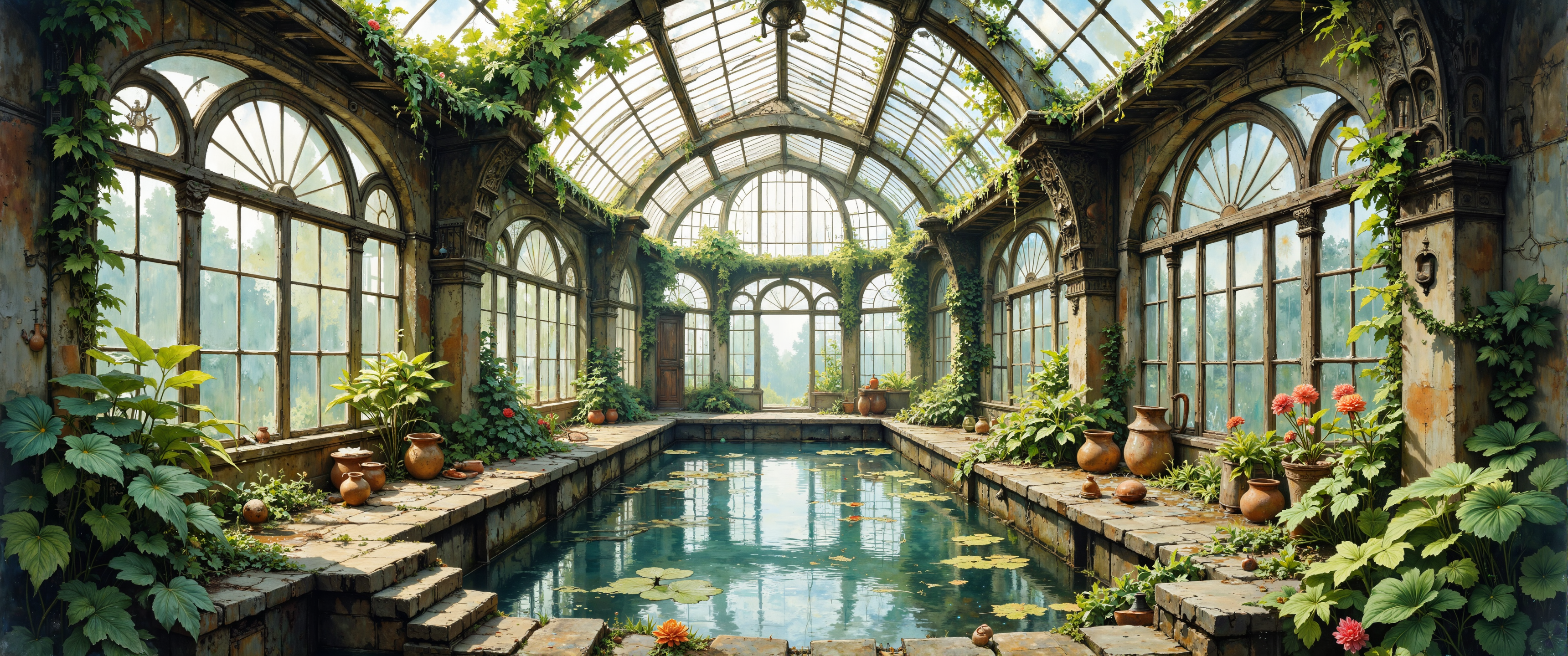 A whimsical abandoned greenhouse captured in delicate watercolor, where sunlight filters through broken glass panes creating scattered prismatic reflections on pooling water below. Translucent washes of emerald and jade depict wild vines reclaiming ornate Victorian ironwork, with bleeding edges where pigment has beautifully migrated across the textured paper. Fallen terracotta pots and scientific instruments lie half-submerged in shallow puddles, rendered in soft sienna and burnt umber with feathered brushwork. The controlled diffusion of indigo shadows creates depth while maintaining luminosity, complemented by touches of vibrant cerulean where sky peeks through the fractured ceiling. Masterful wet-on-wet technique brings atmospheric mist alive, suspended in air with graduated transparency between structural elements. The interplay between deliberate dry brush textures for architectural details and fluid color blooms in the vegetation demonstrates sublime watercolor mastery, all bathed in the ethereal glow of afternoon light that suffuses the composition with melancholic beauty. <lora:flux_semifluid_pigments:0.3> <lora:Anime realistic V1:0.5> <lora:Memadukan_Brush_Strokes_of_Fineart:0.4> <lora:flux_dev:1>