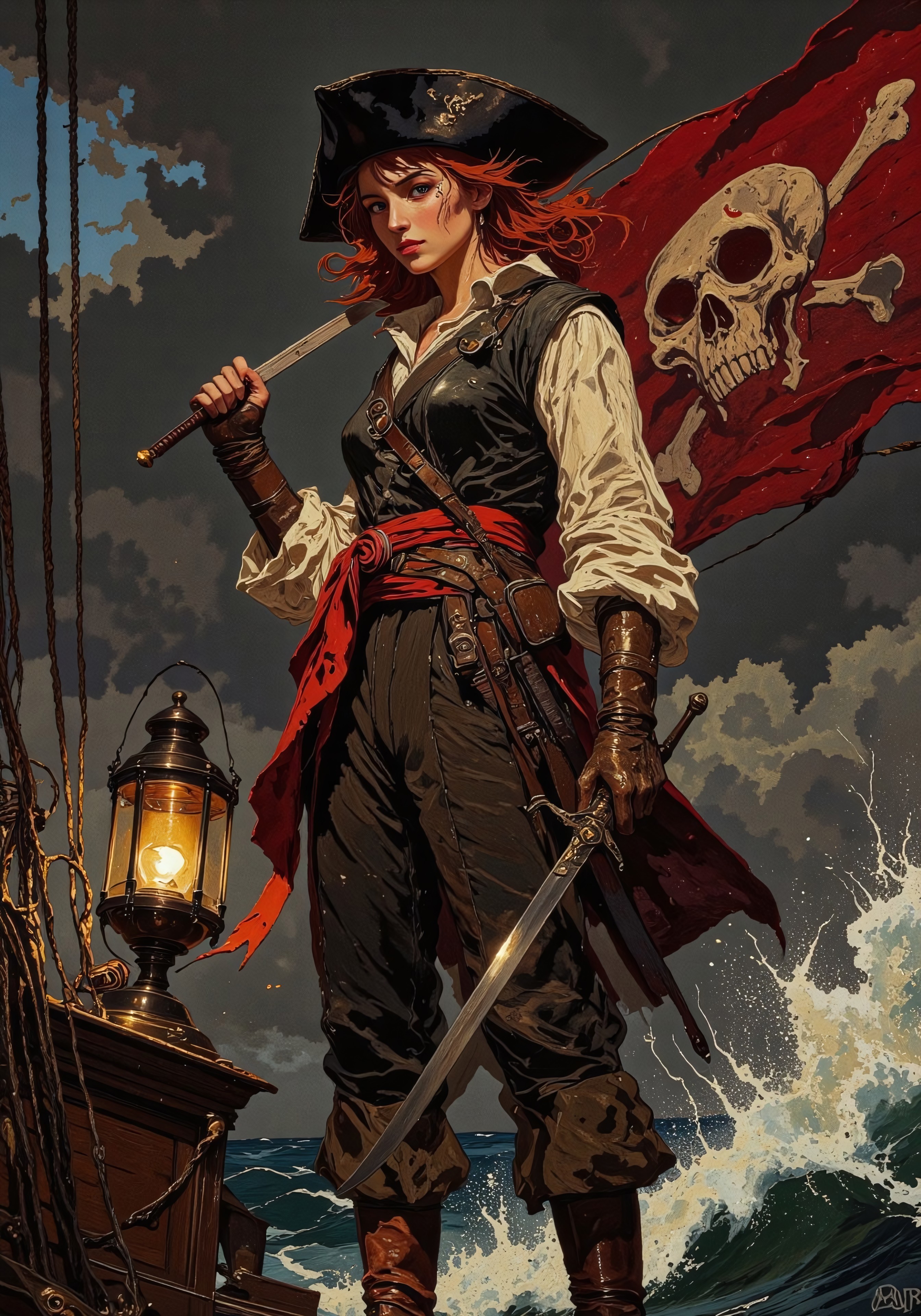 Masterpiece, best quality, A striking, dramatic portrait of Anne Bonny, the legendary female pirate, rim lit, standing boldly on the deck of a pirate ship. She grips a cutlass, a short, broad sabre with a slightly curved blade in one hand, its blade catching the dim light. Her fiery red hair is windswept, wild against the backdrop of a stormy sea, with dark waves crashing beneath a sky of swirling gray clouds. She wears a loose white linen shirt, slightly open at the collar, layered with a fitted dark leather waistcoat. A deep crimson sash is tied at her hip, contrasting with rugged trousers tucked into worn leather boots. A wide-brimmed hat sits atop her head, tilted just enough to cast a shadow over her piercing green eyes, which hold a fierce and determined gaze. Behind her, a tattered Jolly Roger flag flutters in the wind, symbolizing her defiance and fearless spirit. The lighting is moody and dramatic, with warm lantern light flickering against her weathered clothing, highlighting the textures of leather and fabric. The scene exudes adventure, rebellion, and the untamed freedom of the high seas, capturing Anne Bonny’s legendary presence. Ultra-detailed, cinematic lighting, dark fantasy, moody atmosphere, high contrast, hyper-realistic textures. DB4RZ, DB4RZ style painting, Anime art