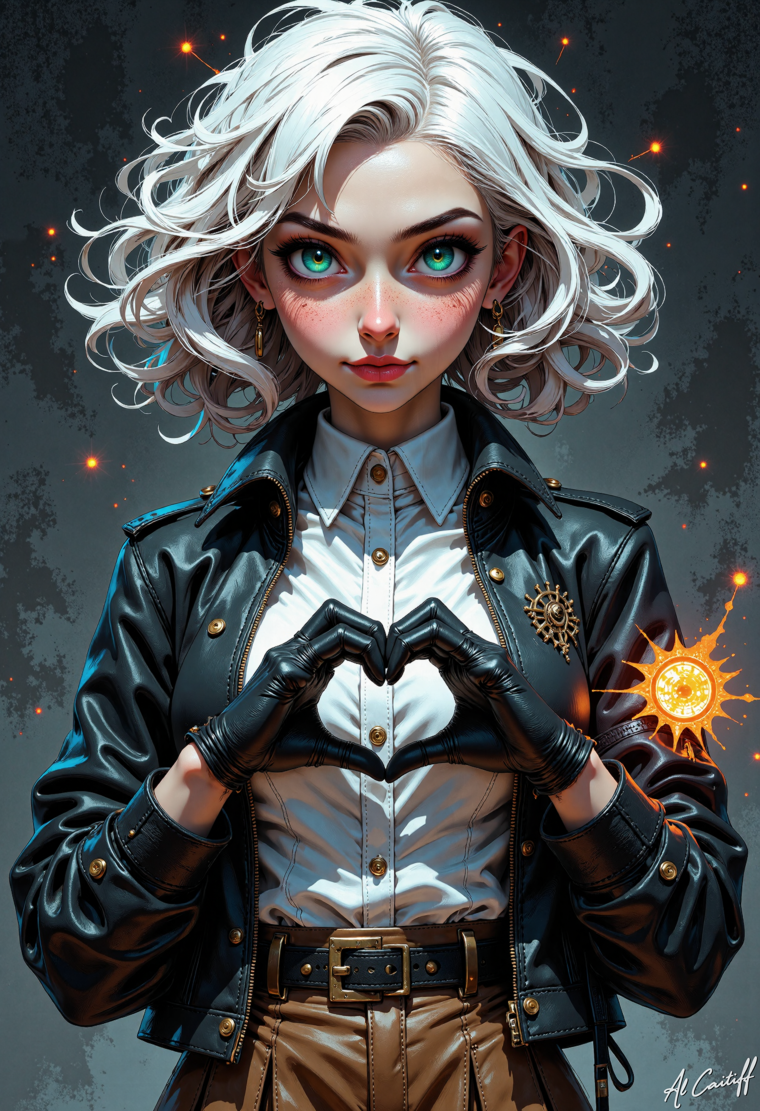 Dutch tilt, 50mm fisheye lens with pronounced barrel distortion, moderate motion blur on the subject's hair, shallow f/4 depth of field. A young woman with vibrant turquoise eyes and shoulder-length, curly silver hair stands against a dark grey background, wearing a crisp white blouse with a high collar and a long, pleated brown skirt with golden buttons. She's wearing a black leather jacket with a silver buckle shaped like a stylized sun and has a pair of black leather gloves on her hands, which are clasped together in front of her chest, forming a heart shape. The woman's face is tilted upwards, and she's smiling slightly, with a few faint, green highlights on her cheeks. A small, stylized sun emblem on her jacket's sleeve glows softly in the dark, casting a warm, golden light on her face,, MysticComic, comic book style, CreeepyCuteMagic<lora:Flux/creeepycutemagic-000012 - version ER.safetensors:0.5:0.5> <lora:CustomFlux/MysticComic.safetensors:0.5000000000000001:0.5000000000000001>