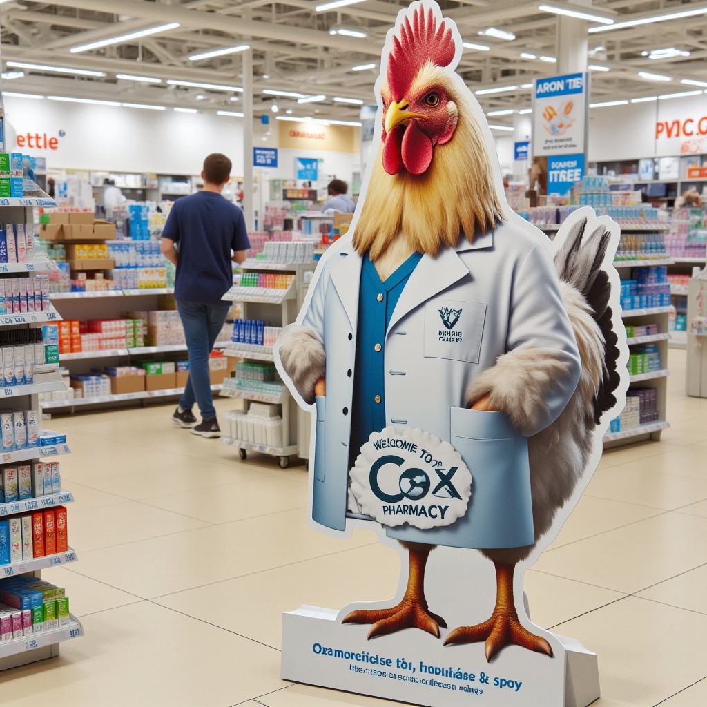 High-resolution photograph taken inside of a pharmacy store, showcasing a large, detailed, 3D cardboard cutout of a chicken wearing a lab coat and text "Welcome to Dr. Cox' Pharmacy"