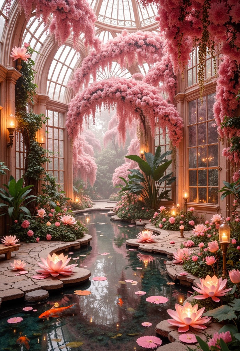 The Rose Quartz & Pearl Celestial Dome (Soft, Romantic, and Dreamlike) A rose-hued steampunk greenhouse ballroom, bathed in the soft glow of pearl-toned lanterns and pastel-stained glass panels. The ceiling shifts subtly, revealing glimpses of mechanical cherubs and celestial charts etched into golden gears. A soft mist drifts over an indoor koi pond, its water reflecting the flickering light of delicate candle-lit brass lotus flowers. The scent of rosewater, honeyed tea, and fresh peonies lingers in the air, evoking a feeling of romantic serenity and celestial wonder.