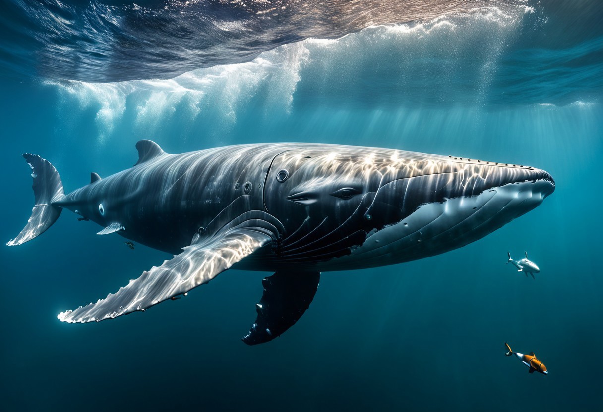 Create a surreal (underwater) scene featuring a large, metallic whale resembling a futuristic submarine. The whale has a streamlined body with a blend of organic and mechanical features, including portholes and a texture that suggests a combination of scales and metal plating. Surrounding the whale, depict two small, orange submersibles equipped with propellers, hovering close to the whale. The water is a deep, rich blue-green with visible swells and bubbles, adding a dynamic sense of movement to the composition. In the background, maintain a sense of depth and mystery, with darker tones and hints of shadowy marine life. The overall atmosphere should feel both otherworldly and captivating, blending elements of nature and technology :: full shot, eye level, soft focus :: hyperrealistic, hyper detailed, photorealistic :: hyperrealistic, hyper detailed, photorealistic :: masterpiece, incredible composition, amazing depth, imposing, meticulously composed, high definition, midjourneyv6.1