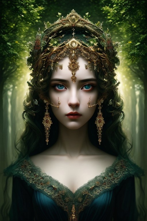 A timeless portrait of a woman in dramatic lighting, optical illusions, double images, hidden faces, surreal landscapes, classical painting style, visual puzzles, layered composition, nature elements, illusionary art, symbolic imagery, realistic detail, mind-bending perspectives