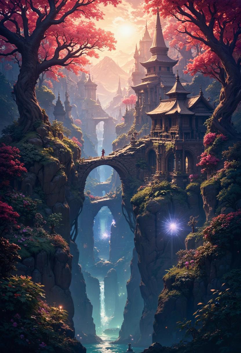 Imagine a stunning fantasy landscape hidden deep within ancient mountains. The landscape glows with magical light and is filled with twisted trees and luminous flora. A forgotten temple appears in the fog and a broken stone bridge spans a mysterious abyss. Great Artwork. High Quality Masterpiece. G0thicL1nes,