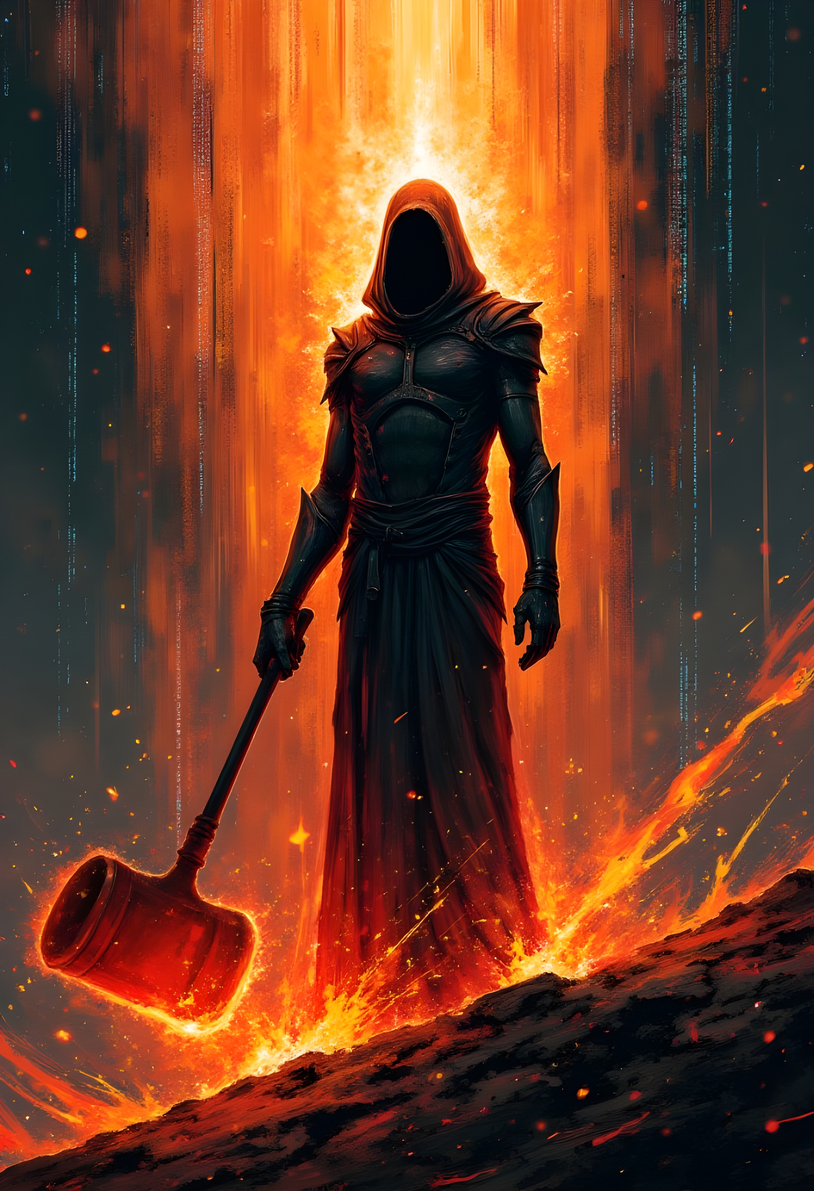 cinna flow, A figure from a realm beyond comprehension rips through the veil of time, wielding a large hammer of shifting flames, against a stark, astral planes background. This nightmarish ghost, has an intense, burning presence. A Matrix-like digital environment is present with burning cinders and cascading codes in shades of orange, and subtle white and blue glitch effects. The art has a tilted fantasy and surrealistic quality and utilizes elements of Abstract Expressionism and extremely beautiful dark undertones. It has intricate details and a minimalistic composition, aiming for a masterpiece of best quality, and has a very dramatic and intimidating pose. The figure stares directly at the viewer, in the style of Greg Simkins and Gerald Brom.