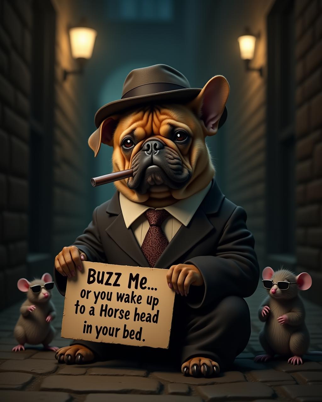 A serious-looking bulldog wearing a tiny suit and fedora, sitting in a dimly lit alleyway, holding a sign that reads "Buzz Me⦠or You Wake Up to a Horse Head in Your Bed." The bulldog has a cigar in its mouth (unlit, of course) and stares like it means business. A few rats in tiny sunglasses lurk in the background, nodding in agreement. Dark, cinematic lighting, mafia movie vibes, absurdly funny --ar 3:4 --v 6.0