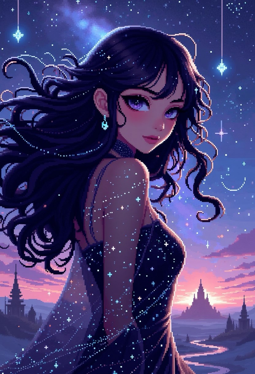 pinkpixelicious, A mystical woman with flowing midnight-black hair laced with silver strands, resembling the Milky Way. Her violet eyes are framed by long dark lashes, and she wears a sheer, starry cloak that glows softly. Crescent moon charms dangle from her ears, and behind her, a vast cosmic landscape of swirling nebulae and ancient temples stretches infinitely.